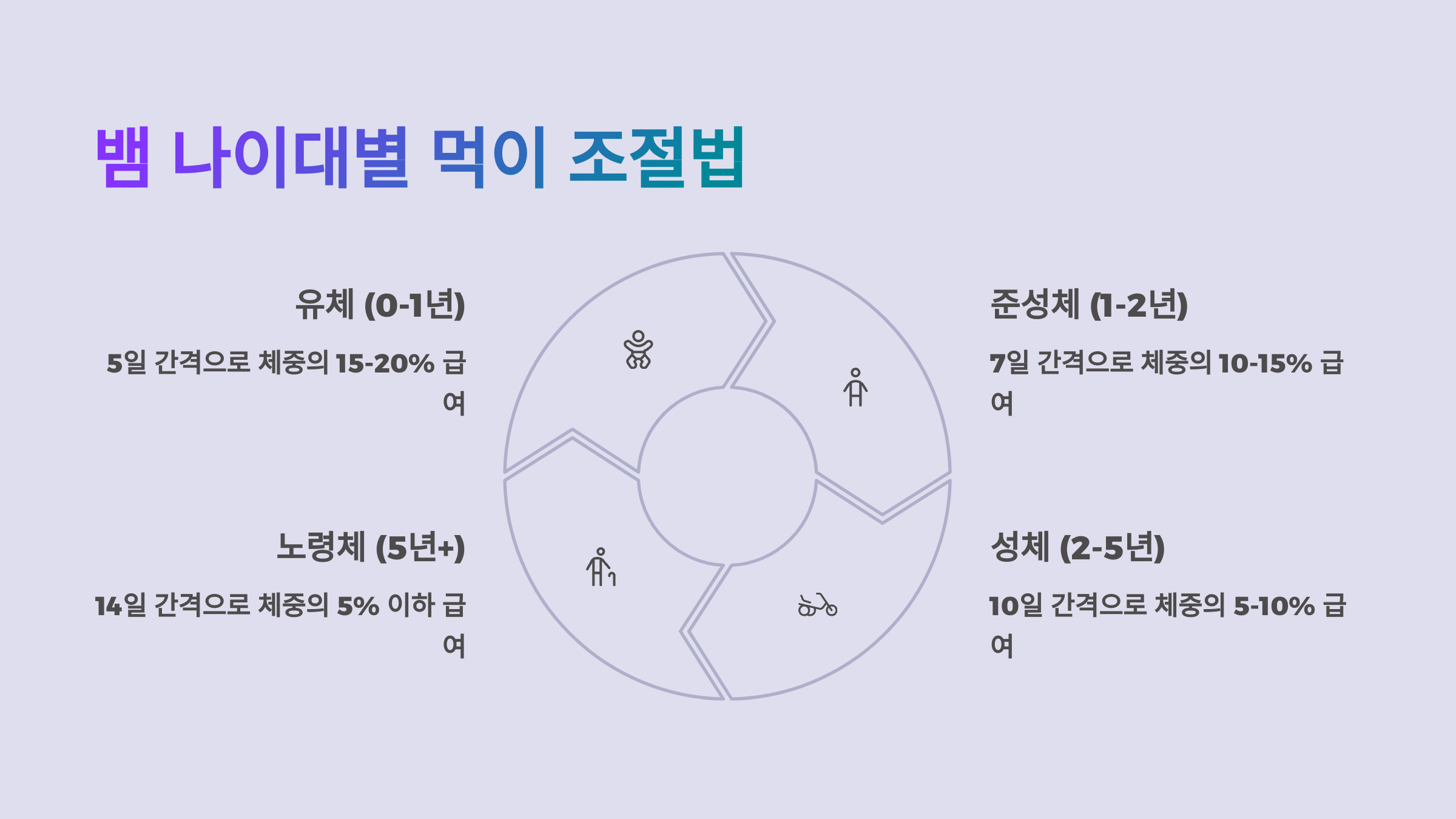 | 성체 (10개월 이상) | 성체 마우스 또는 중형 랫츠 | 몸통 굵기보다 큰 건 금지 |