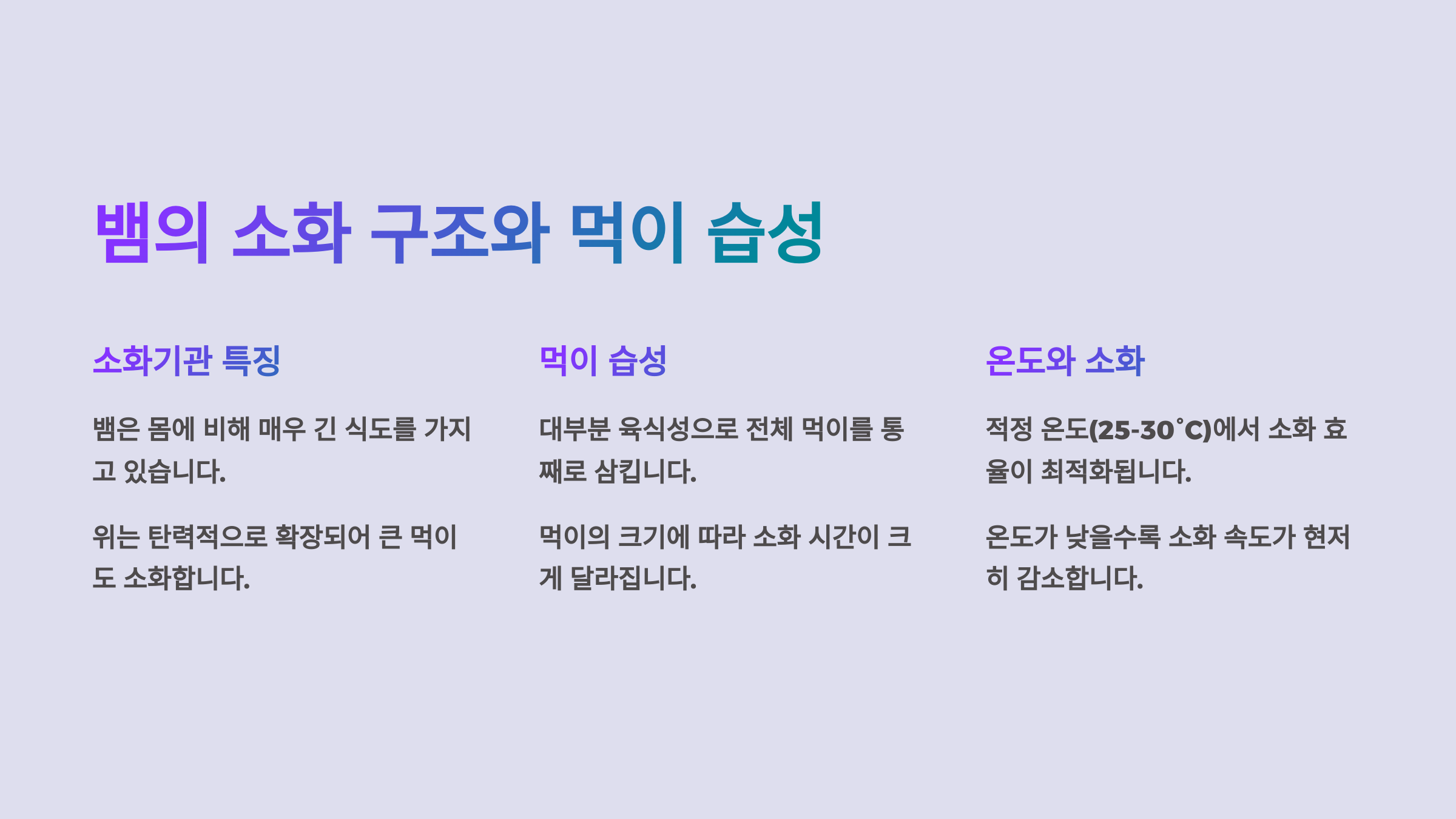 🐍 한 번에 먹이를 통째로 삼키고, 소화에 수일에서 길게는 수 주까지 걸리기도 해요. 그래서 매일 먹이는 금물이고, 정확한 간격을 두는 게 중요하답니다.