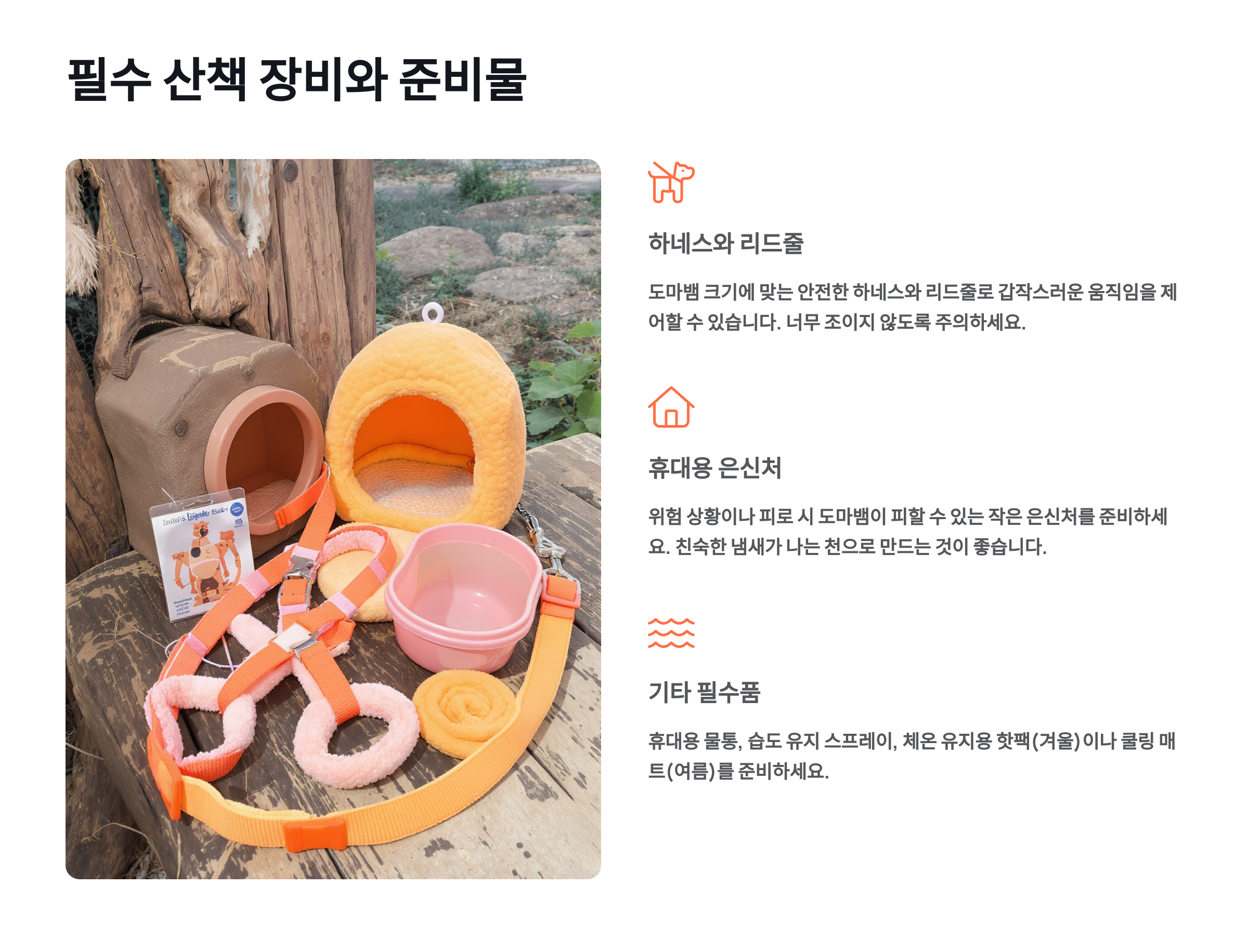 | 하네스 & 리드줄 | 안전한 이동 | 크기 조절 가능, 부드러운 소재 |