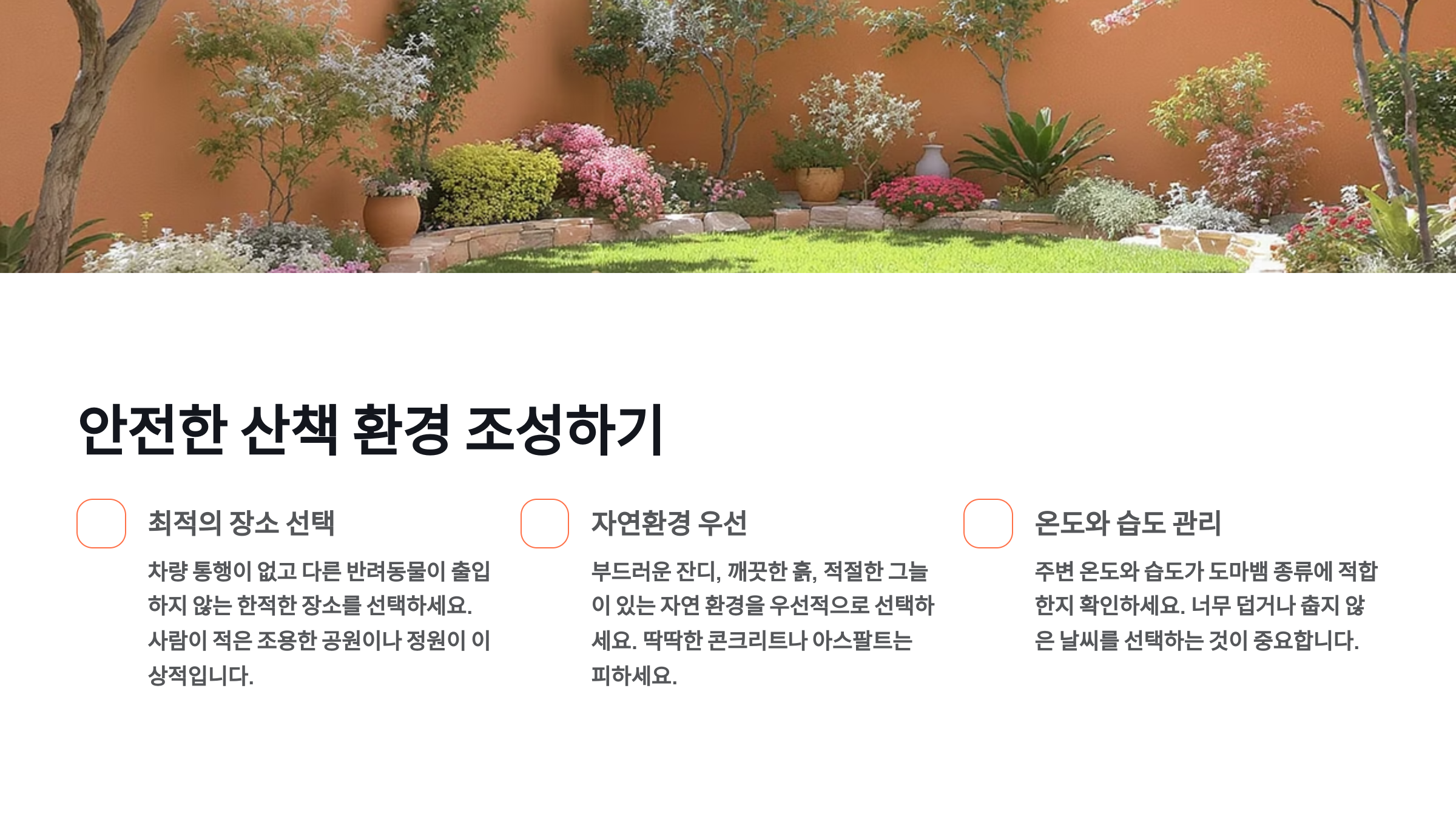 산책 코스를 미리 답사하는 것도 필수예요. 위험한 요소가 없는지, 도망갈 수 있는 틈새나 구멍은 없는지 확인해야 해요. 특히 하수구, 배수구, 덤불 등은 도마뱀이 들어가면 찾기 어려운 곳이니 주의해야 해요. 또한 독성 식물이나 살충제가 뿌려진 곳도 피해야 한답니다.