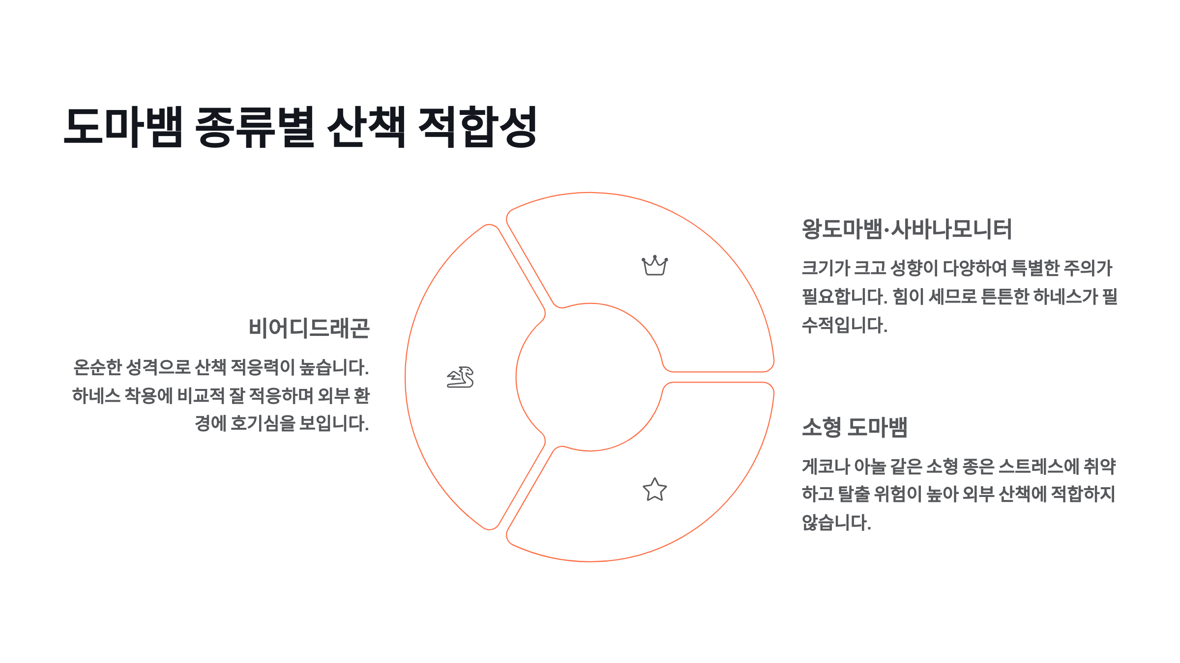 도마뱀의 종류에 따라 산책 적합성이 크게 달라요. 비어디드 드래곤은 산책에 가장 적합한 도마뱀 중 하나예요. 성격이 온순하고 사람을 잘 따르며, 하네스 착용에도 잘 적응한답니다. 호주가 원산지인 이 도마뱀은 다양한 환경에 적응력이 좋아서 산책을 즐기는 편이에요. 크기도 적당해서 다루기 쉽고, 활동적인 성격 덕분에 산책을 좋아해요.