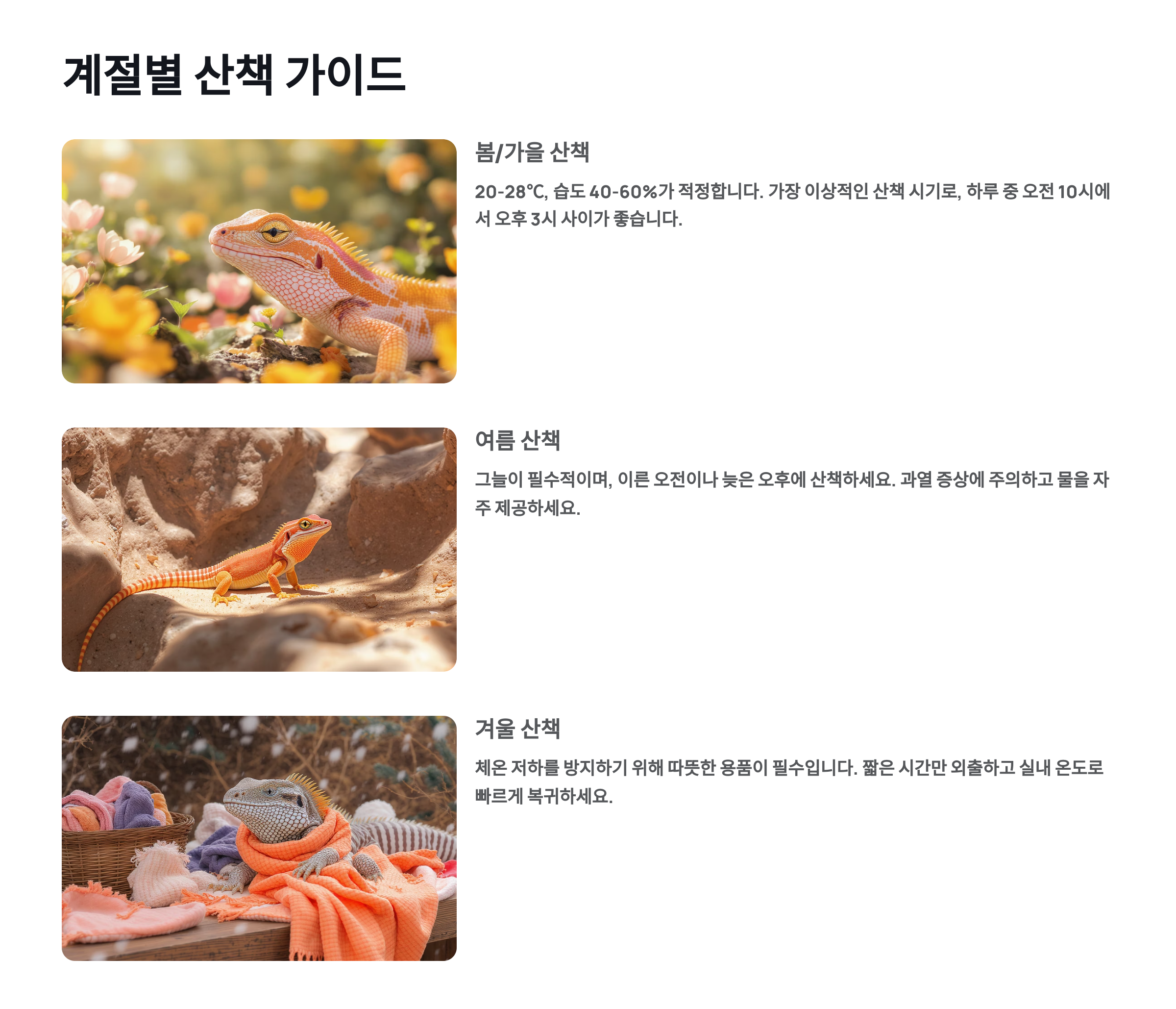계절별로 산책 코스를 다르게 선택하는 것도 좋은 방법이에요. 여름에는 물가나 숲속 같은 시원한 곳, 겨울에는 햇빛이 잘 드는 양지바른 곳을 선택하세요. 계절마다 다른 풍경을 즐기면서 도마뱀에게도 새로운 자극을 줄 수 있어요. 사계절 내내 안전하고 즐거운 산책을 즐기세요! 🌸🌞🍂❄️