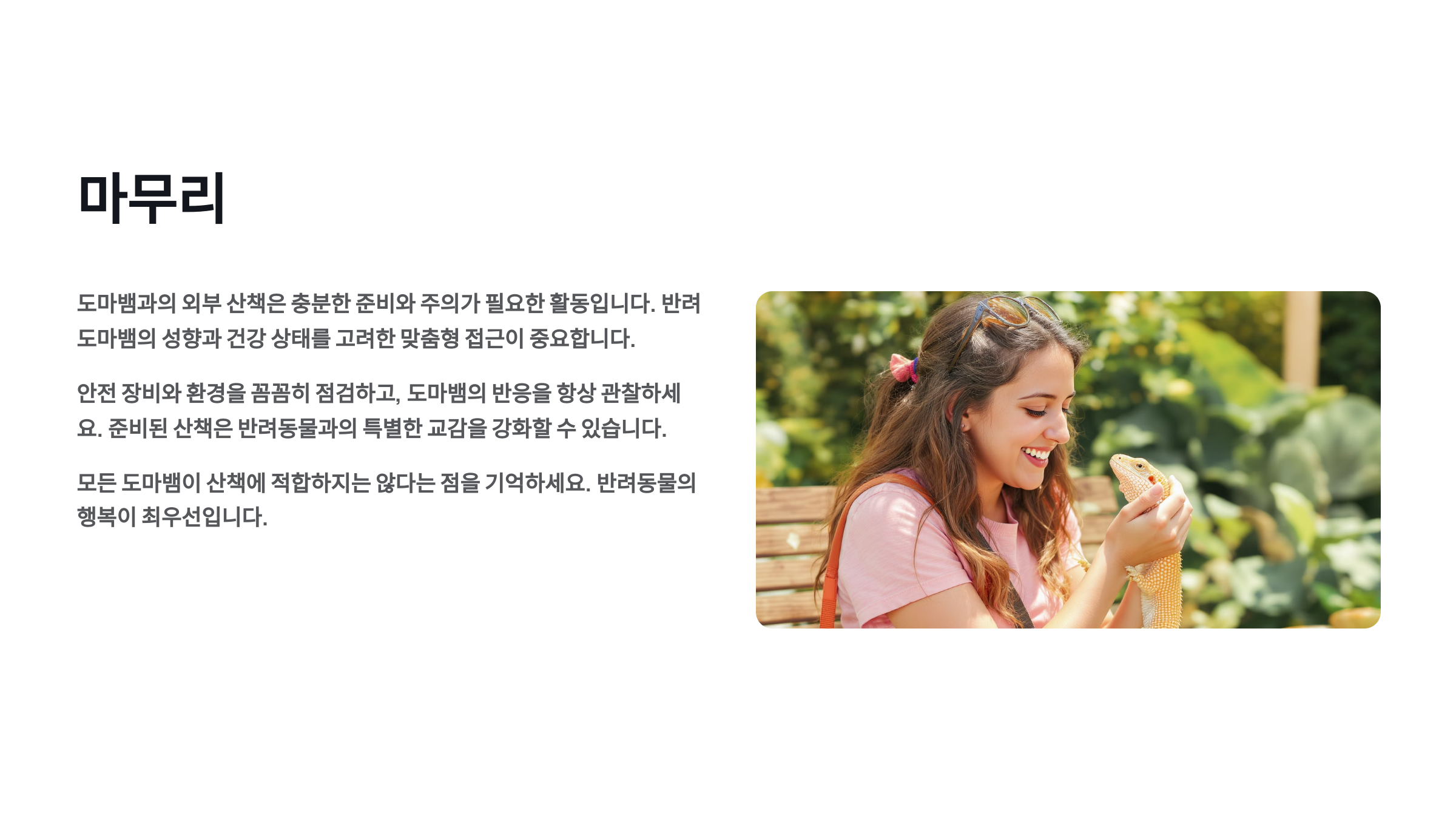 무엇보다 중요한 것은 도마뱀의 건강과 안전이에요. 스트레스 신호를 잘 관찰하고, 위험 요소를 미리 파악해서 대비하는 것이 필요해요. 산책은 도마뱀에게 새로운 자극과 운동 기회를 제공하지만, 모든 도마뱀이 산책을 즐기는 것은 아니라는 점도 기억해주세요. 여러분의 도마뱀이 행복하고 건강하게 생활할 수 있도록 최선을 다해주세요! 🦎💚