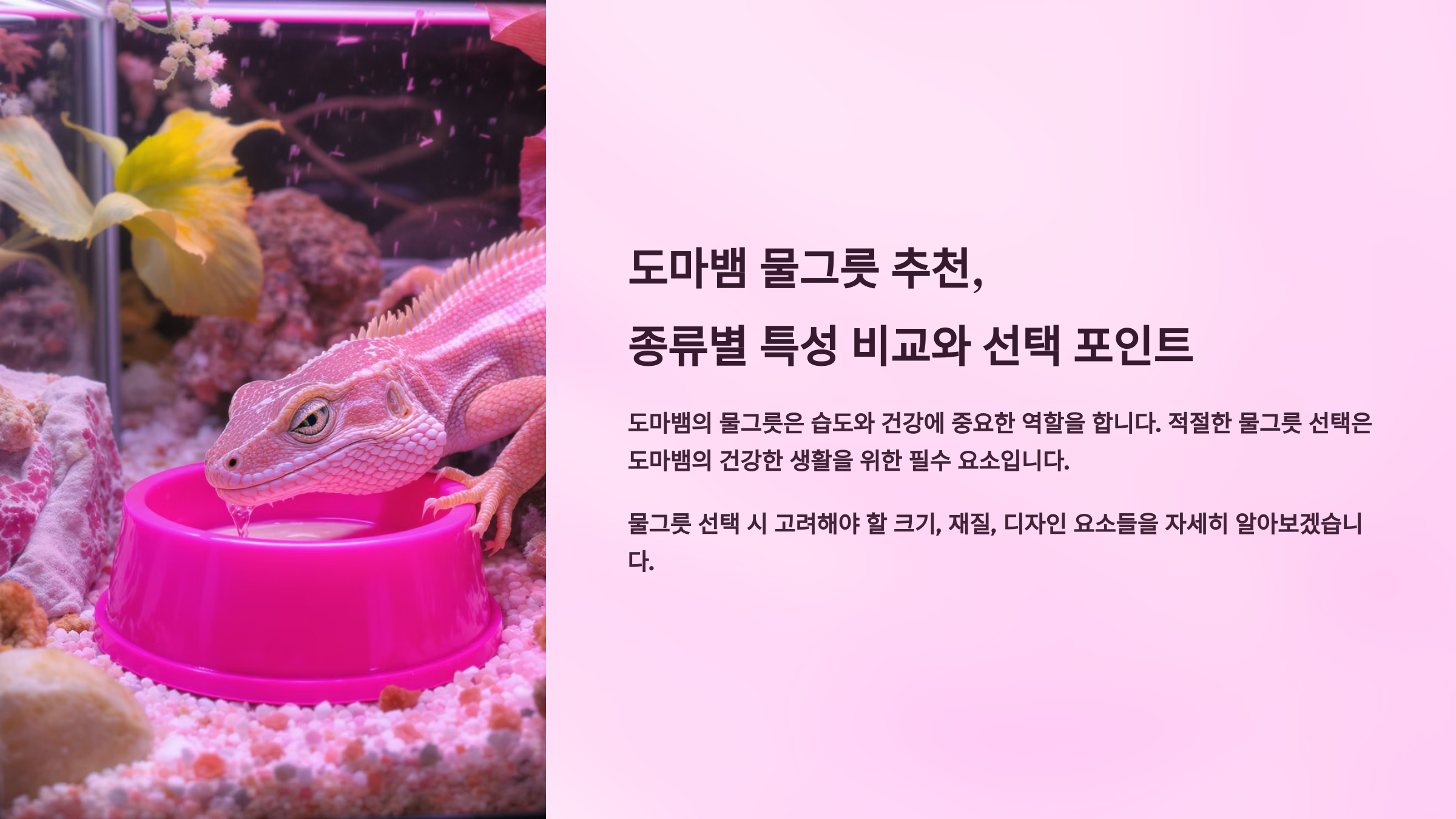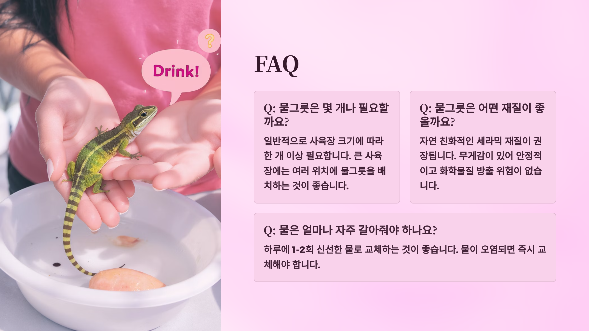 도마뱀과 함께하는 시간이 행복하고 건강하기를 바라요. 작은 관심과 사랑이 모여 멋진 반려 관계를 만들어갈 수 있을 거예요. 여러분의 도마뱀이 항상 신선한 물을 마시며 건강하게 자라기를 응원합니다! 🦎💚