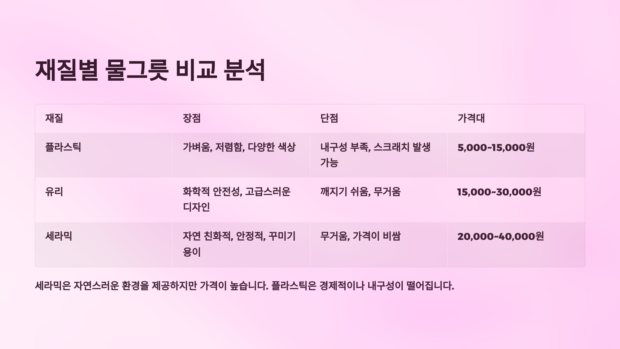 물그릇의 재질은 도마뱀의 건강과 직결되는 중요한 요소예요. 플라스틱, 세라믹, 유리, 스테인리스 등 다양한 재질이 있는데 각각 장단점이 뚜렷하답니다. 플라스틱 물그릇은 가볍고 저렴해서 많이 사용되지만, 박테리아가 번식하기 쉽고 긁힘이 생기면 위생 문제가 발생할 수 있어요.