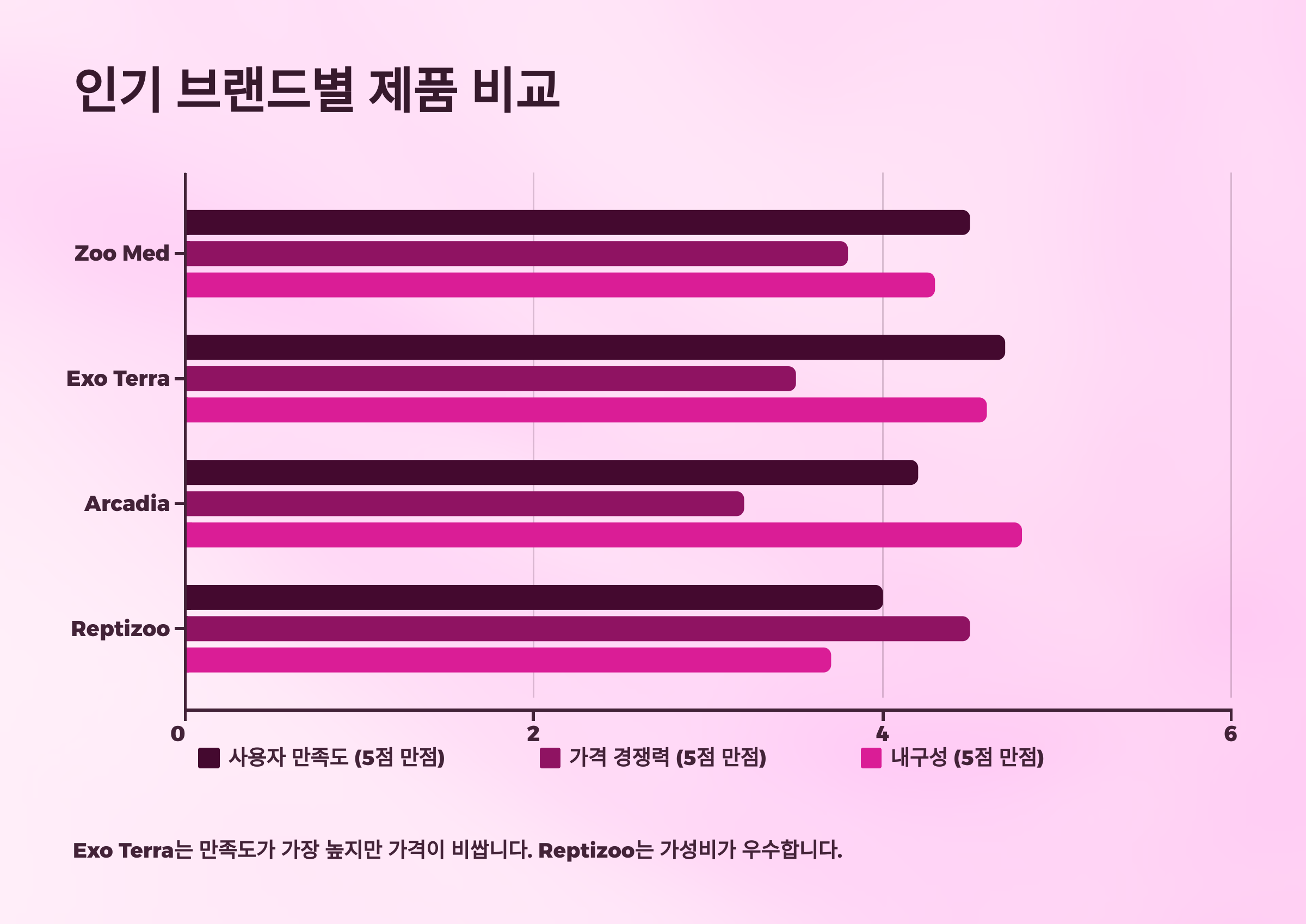 국내 브랜드들도 품질이 많이 향상되었어요. 렙타일팜, 헤르페토 같은 브랜드들이 한국 시장에 맞는 제품을 출시하고 있답니다. A/S가 편리하고 배송이 빠른 것이 장점이에요. 특히 한국에서 인기 있는 도마뱀 종류에 최적화된 제품들을 만들어내고 있어요.
