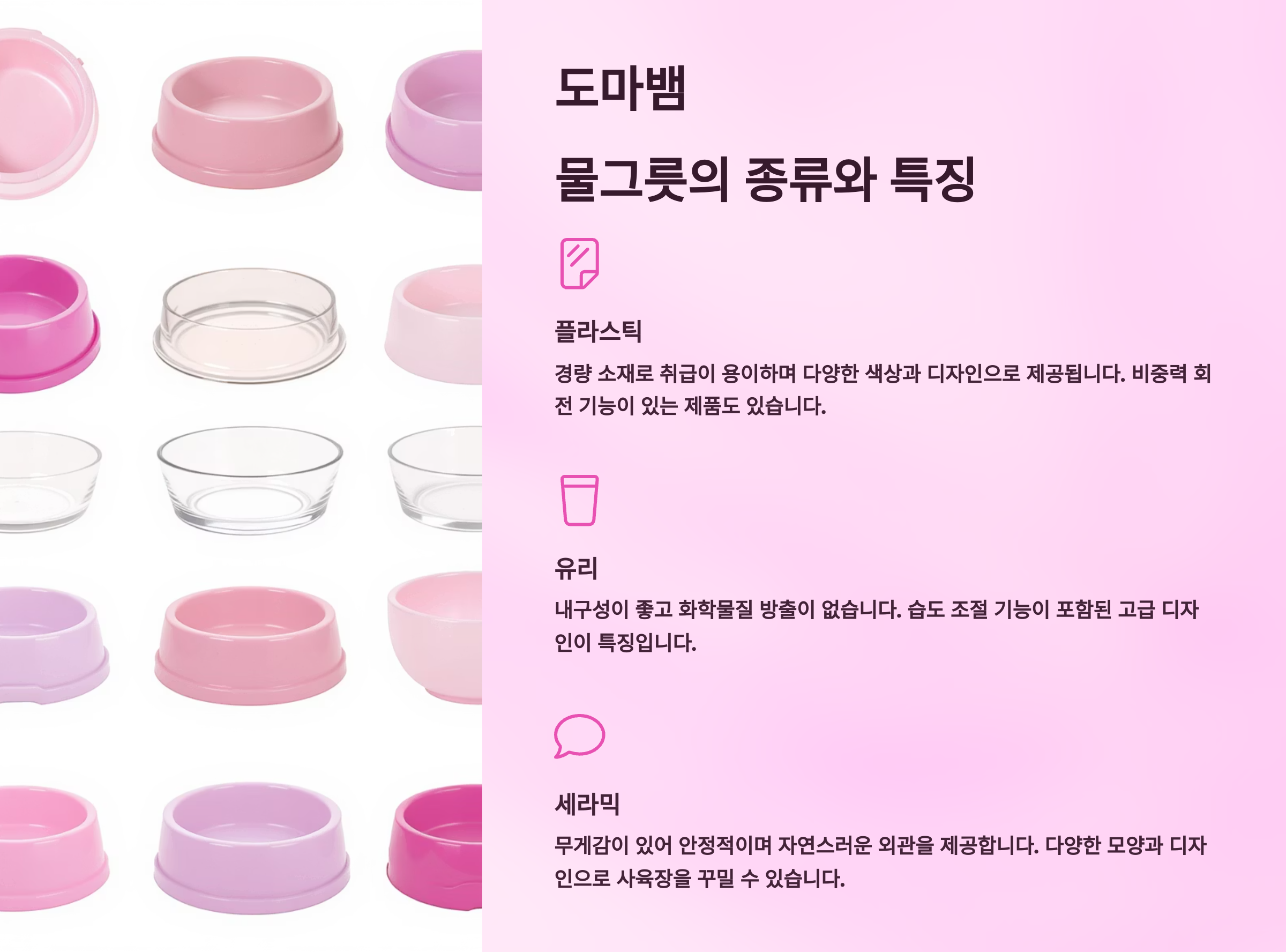 A2. 세라믹 물그릇이 일반적으로 더 위생적이고 안정적이에요. 무게가 있어서 뒤집힐 위험이 적고, 표면이 매끄러워 청소가 쉽답니다. 다만 가격이 비싸고 깨질 수 있다는 단점이 있어요. 플라스틱은 저렴하고 가볍지만 긁힘이 생기면 박테리아가 번식하기 쉬워요.