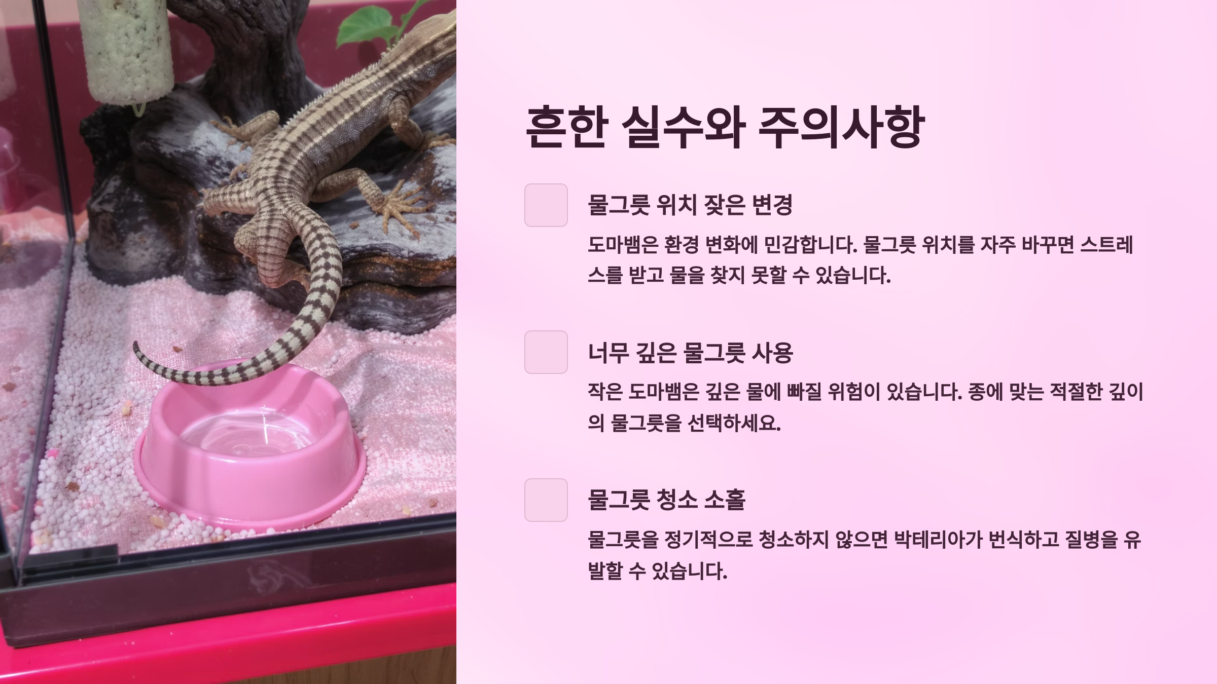 청소를 소홀히 하는 것도 큰 실수예요. 맑아 보이는 물도 박테리아가 번식할 수 있답니다. 특히 여름철에는 하루만 방치해도 물이 상할 수 있어요. 귀찮더라도 매일 물을 갈아주는 습관을 들이세요. 도마뱀의 건강은 작은 관리에서 시작된답니다.