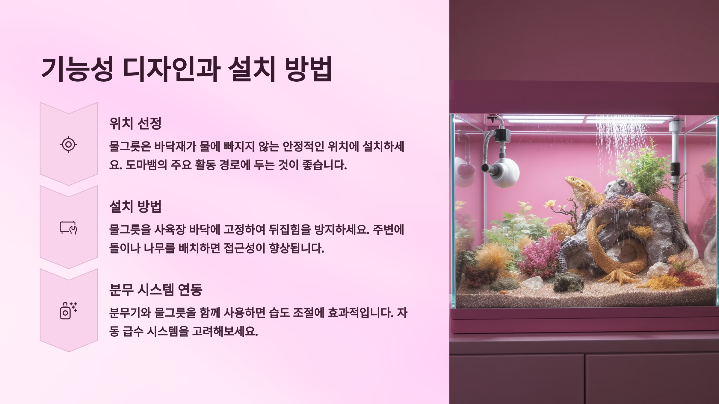 물그릇 위치도 신중하게 결정해야 해요. 열원 바로 아래는 물이 빨리 증발하고, 너무 차가운 곳은 도마뱀이 꺼려할 수 있어요. 사육장의 중간 지점이나 약간 서늘한 쪽에 배치하는 것이 이상적이랍니다. 은신처 근처에 두면 도마뱀이 더 편안하게 물을 마실 수 있어요.