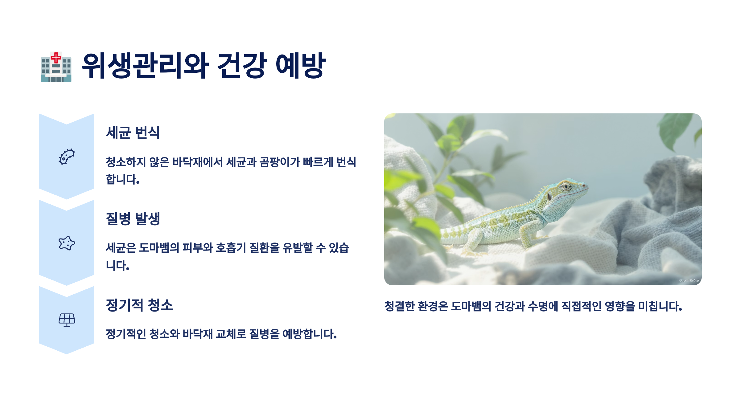 심층 청소를 할 때는 도마뱀의 건강 상태도 함께 체크하는 것이 좋아요. 피부 상태, 눈의 맑기, 활동성 등을 관찰하면서 이상이 없는지 확인해보세요. 정기적인 심층 청소는 단순히 위생 관리뿐만 아니라 도마뱀의 건강 체크 기회가 되기도 한답니다! 💪