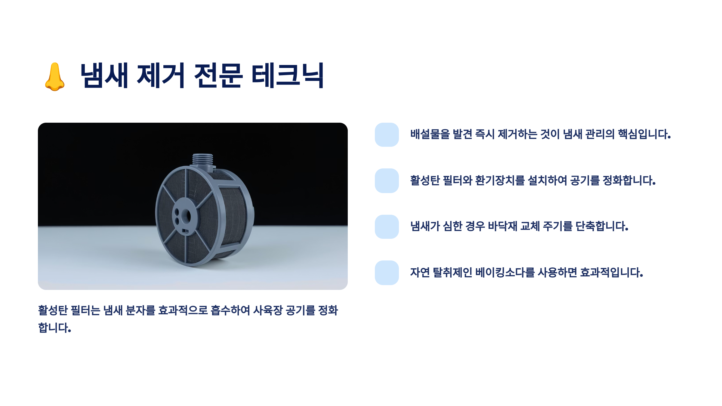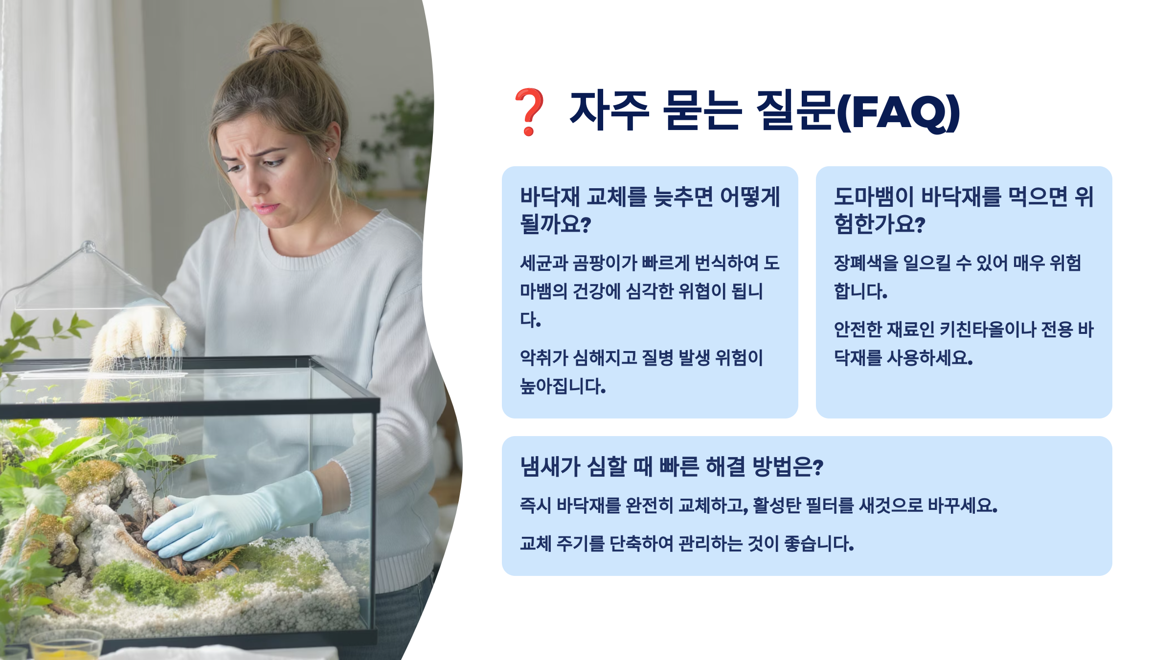 A8. 바닥재에 냄새가 배었을 수 있어요. 전체 바닥재를 교체하고, 사육장을 완전히 소독하세요. 활성탄이나 제올라이트를 사용하면 잔여 냄새 제거에 도움이 됩니다.