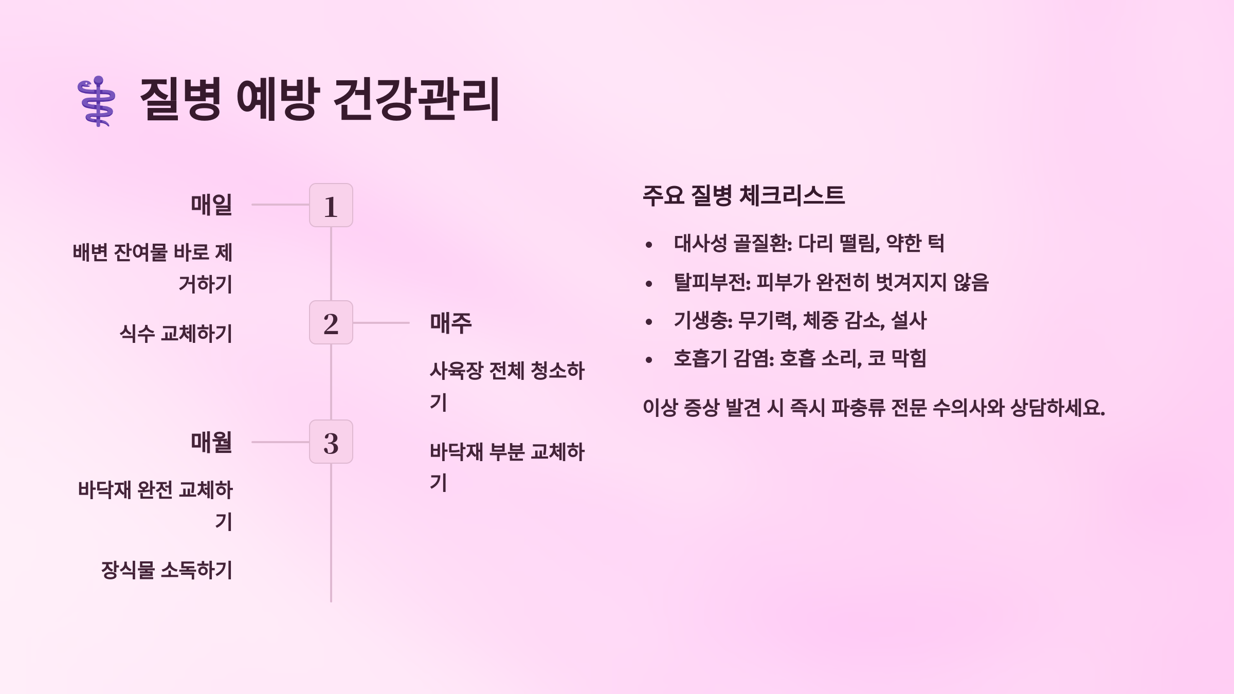 호흡기 질환은 온도와 습도 관리 부실로 인해 발생하는 경우가 많아요. 입을 벌리고 숨쉬거나, 천명음, 점액성 분비물이 나타나면 호흡기 감염을 의심해야 해요. 세균성 피부염은 불결한 환경이나 상처 부위의 2차 감염으로 발생하며, 피부에 붉은 반점이나 궤양이 생겨요. 기생충 감염도 주의해야 할 질병인데, 야생에서 채집한 곤충을 먹이로 줄 때 특히 위험해요. 정기적인 분변 검사를 통해 기생충 감염 여부를 확인하는 것이 좋아요.