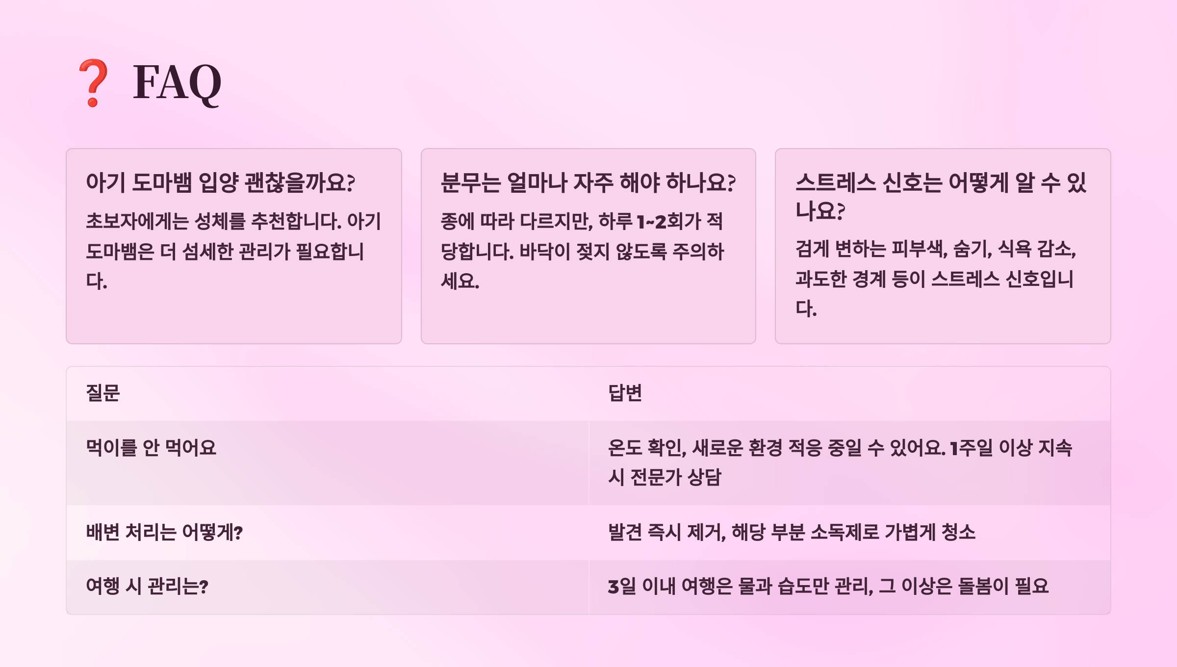 A1. 먹이 거부는 여러 원인이 있을 수 있어요. 먼저 온도가 적절한지 확인하고, 탈피 중이거나 스트레스를 받지 않았는지 체크해 보세요. 새로운 환경에 적응 중이거나 계절 변화로 인한 일시적 현상일 수도 있어요. 3일 이상 지속되면 수의사 상담을 받아보세요.