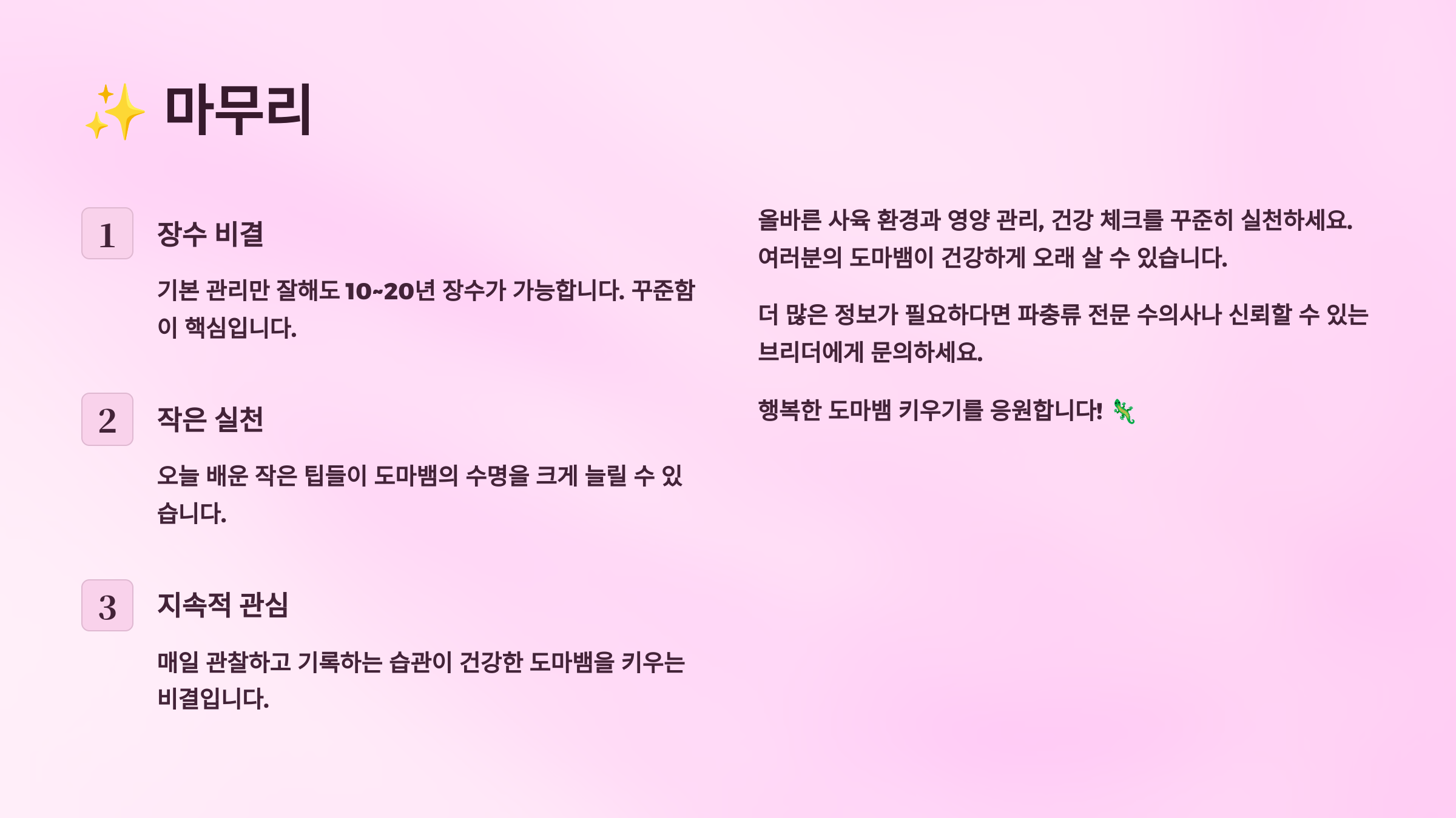 무엇보다 중요한 것은 꾸준한 관찰과 학습이에요. 도마뱀마다 개성이 다르고 선호하는 환경이 조금씩 달라서, 책이나 인터넷 정보만으로는 한계가 있어요. 자신이 키우는 도마뱀의 행동 패턴과 건강 상태를 파악하고, 그에 맞는 맞춤형 케어를 제공하는 것이 수명 연장의 비결이랍니다. 도마뱀과 함께하는 긴 여정에서 서로 신뢰할 수 있는 관계를 만들어 나가시길 바라요! 🦎✨