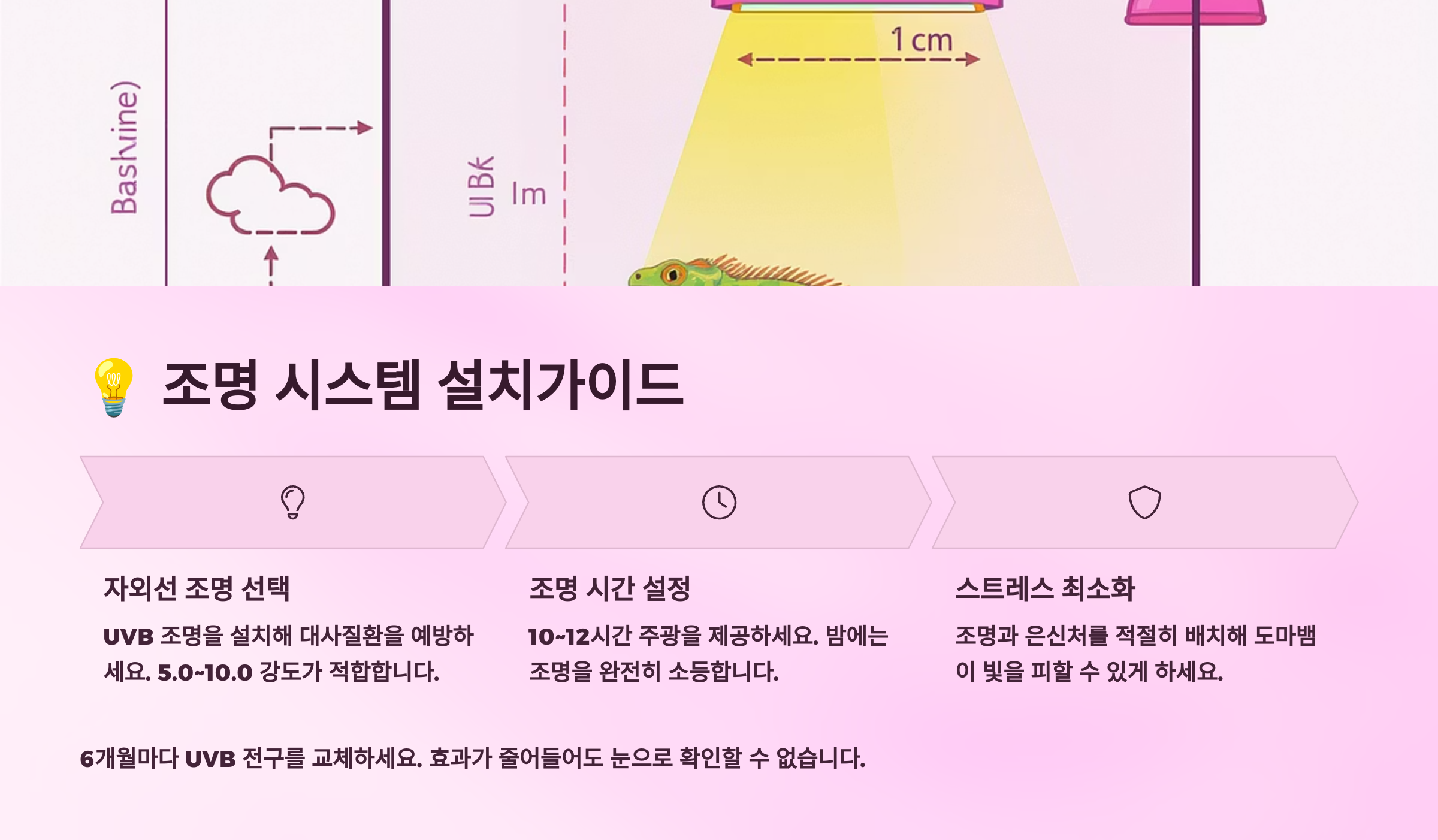 | 조명 타입 | UVB 출력 | 권장 거리 | 교체 주기 |