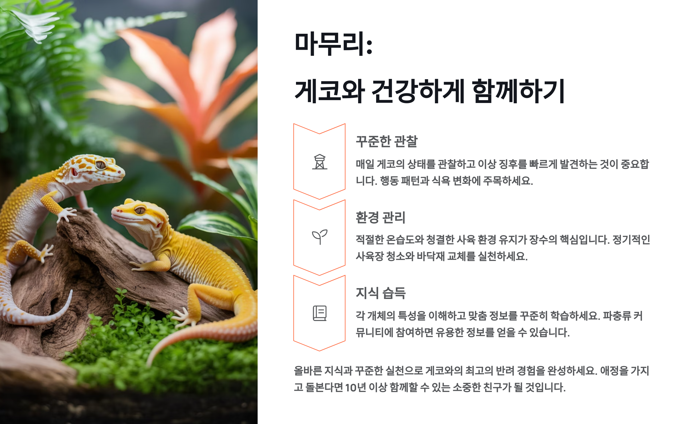 게코 사육은 단순한 취미를 넘어 생명에 대한 책임감을 배우는 과정이에요. 매일 관찰하고 돌보면서 자연의 신비로움을 가까이에서 경험할 수 있죠. 이 글이 여러분의 게코 사육 여정에 도움이 되었기를 바라며, 건강하고 행복한 게코 라이프를 응원합니다! 🦎💚