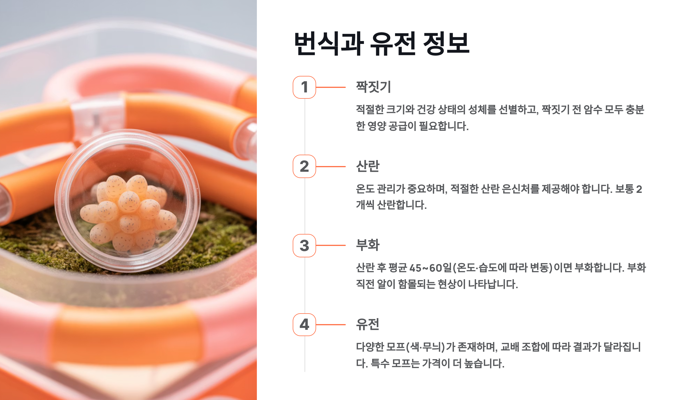 게코 번식은 생명의 신비를 직접 경험할 수 있는 특별한 과정이에요. 하지만 단순히 암수를 합사한다고 번식이 되는 것은 아니에요. 건강한 부모 개체 선택부터 교배, 산란, 부화, 육아까지 전 과정에 세심한 관리가 필요하답니다. 레오파드게코와 팻테일게코의 번식 과정을 단계별로 알아볼게요.