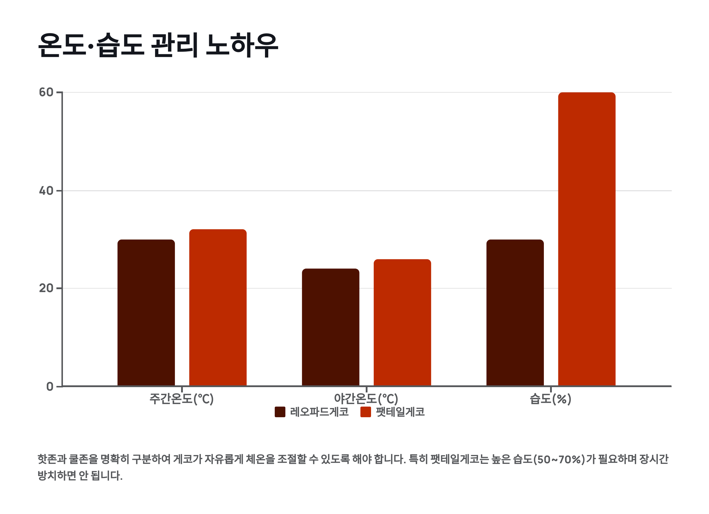 습도 관리는 두 종의 가장 큰 차이점이에요. 레오파드게코는 30-40%의 낮은 습도를 선호해요. 한국의 여름철에는 자연 습도가 이보다 높을 수 있어서 제습이나 환기가 필요할 수 있어요. 반대로 겨울철 난방으로 인한 건조함은 문제가 되지 않는 편이에요. 다만 탈피 시에는 습윤 은신처를 제공해야 해요.