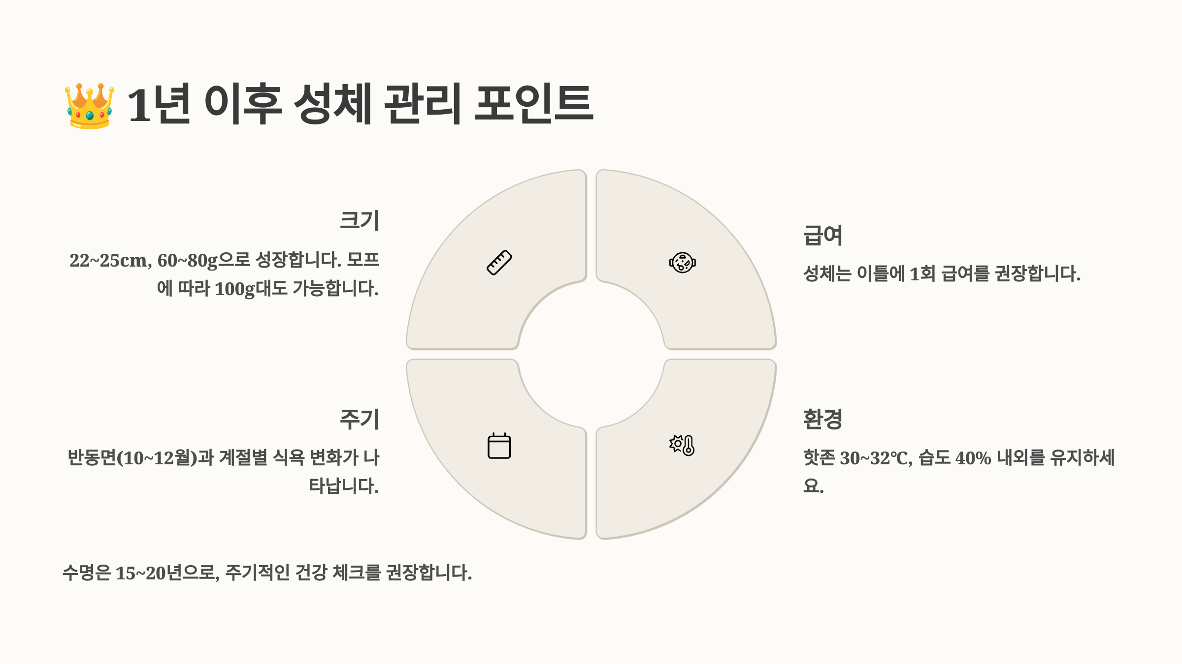 성체가 되면 번식이 가능해지는데, 번식을 계획한다면 철저한 준비가 필요해요. 암컷은 번식기에 많은 에너지를 소모하므로 충분한 영양 공급이 필수예요. 칼슘 보충은 특히 중요한데, 산란 전후로 칼슘 요구량이 급격히 증가하기 때문이에요.