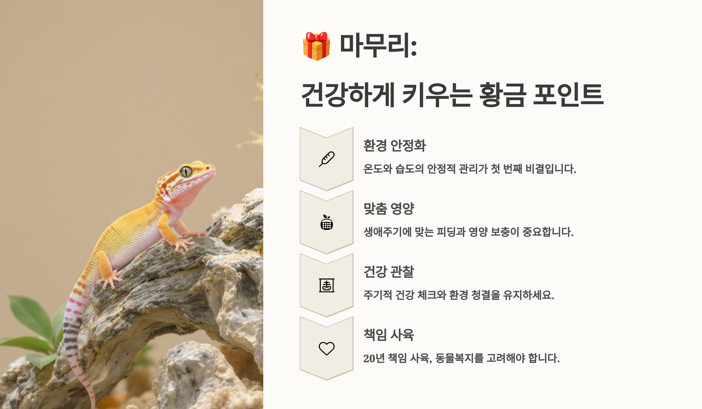 레오파드게코와의 생활은 책임감도 필요하지만, 그만큼 큰 기쁨과 보람을 줘요. 여러분의 사랑과 정성으로 키운 게코가 건강하게 자라 15-20년을 함께한다면, 그보다 더 큰 행복이 있을까요? 이 가이드가 여러분의 게코 육아에 도움이 되길 바라며, 행복한 게코 라이프를 응원합니다! 🦎✨