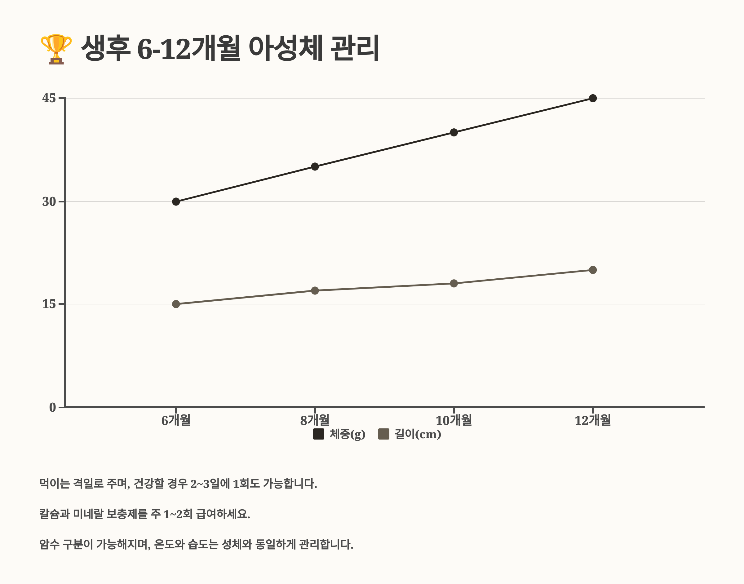 11-12개월이 되면 드디어 완전한 성체로 간주할 수 있어요. 체중은 수컷의 경우 70-90g, 암컷은 60-80g 정도가 정상 범위예요. 이제부터는 번식도 가능하지만, 첫 번식은 18개월 이후가 안전해요. 특히 암컷의 경우 너무 이른 번식은 난포 정체나 기타 생식기 문제를 일으킬 수 있어요.
