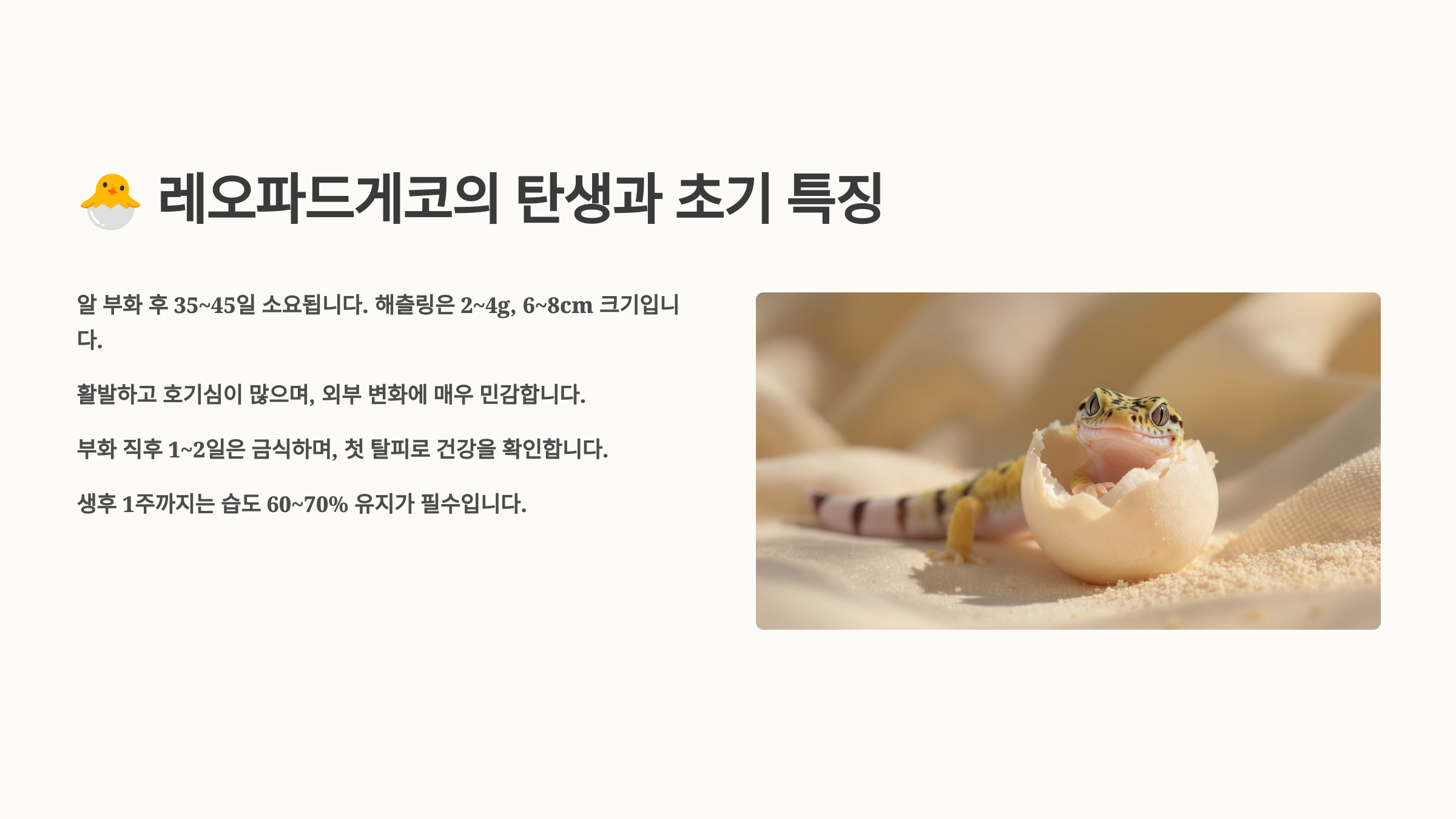 부화 직후 48시간은 레오파드게코의 생존에 있어 가장 중요한 시기예요. 이때 환경이 적절하지 않으면 첫 탈피에 실패하거나 탈수로 인한 문제가 발생할 수 있어요. 특히 습도 관리가 정말 중요한데, 습윤 은신처를 반드시 준비해주세요. 코코피트나 물이끼를 살짝 적셔서 플라스틱 통에 넣어두면 완벽한 습윤 은신처가 된답니다! 🏠