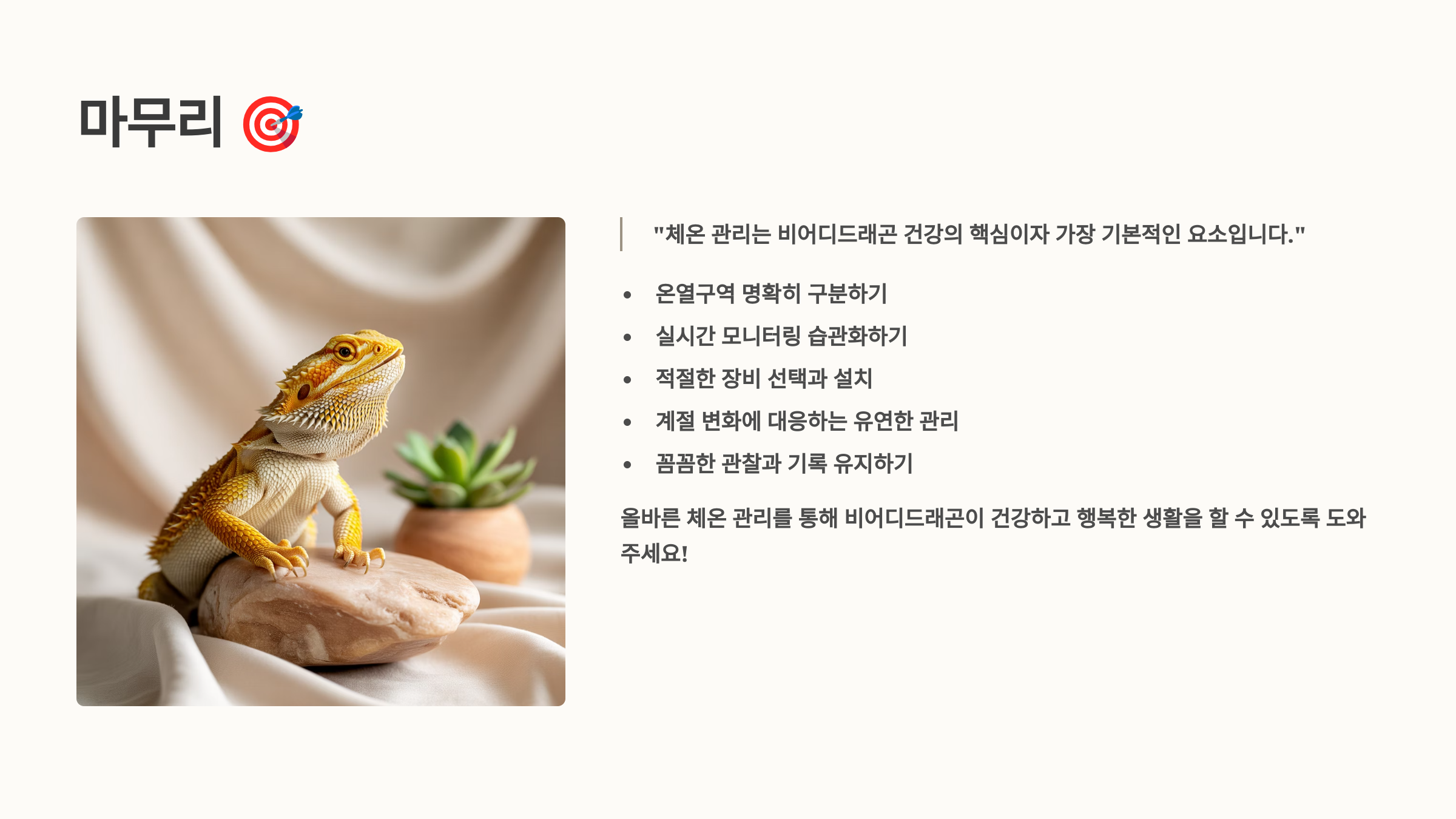 이 글에서 다룬 내용들을 하나씩 실천해보면서 여러분의 드래곤에게 가장 적합한 환경을 찾아가세요. 처음에는 어려워 보일 수 있지만, 시간이 지나면 자연스럽게 익숙해질 거예요. 무엇보다 드래곤의 행동과 건강 상태를 꾸준히 관찰하는 것이 가장 중요해요. 사랑하는 반려동물을 위한 노력은 결코 헛되지 않을 거예요! 🦎💚