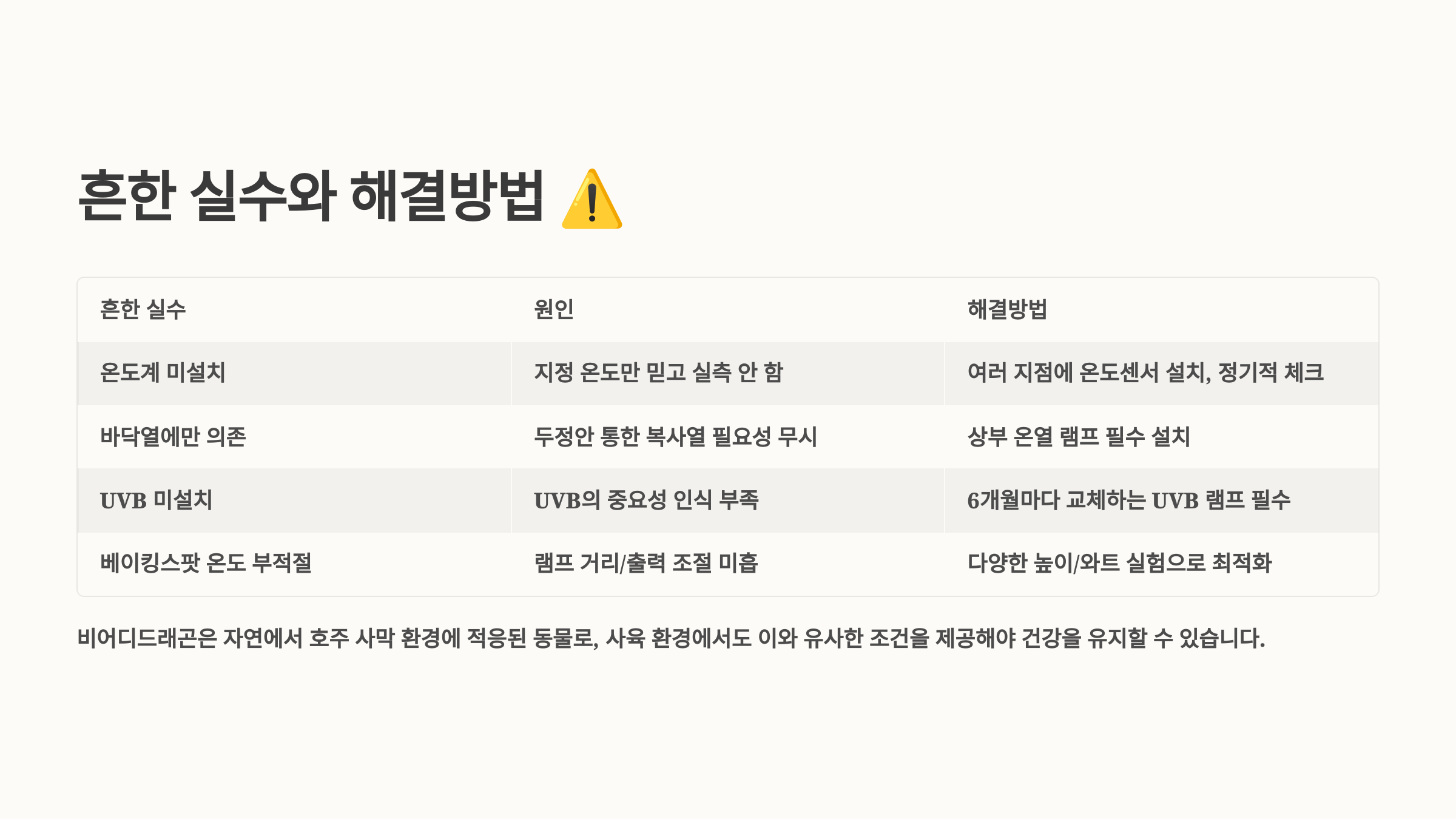 비어디드래곤 온도 관리에서 초보자들이 자주 하는 실수들이 있어요. 이런 실수들은 드래곤의 건강에 직접적인 영향을 미칠 수 있기 때문에 미리 알고 예방하는 것이 중요해요. 제가 직접 경험했거나 주변에서 본 사례들을 바탕으로 가장 흔한 실수들과 그 해결방법을 정리해봤어요. 이 내용을 숙지하면 많은 시행착오를 줄일 수 있을 거예요.