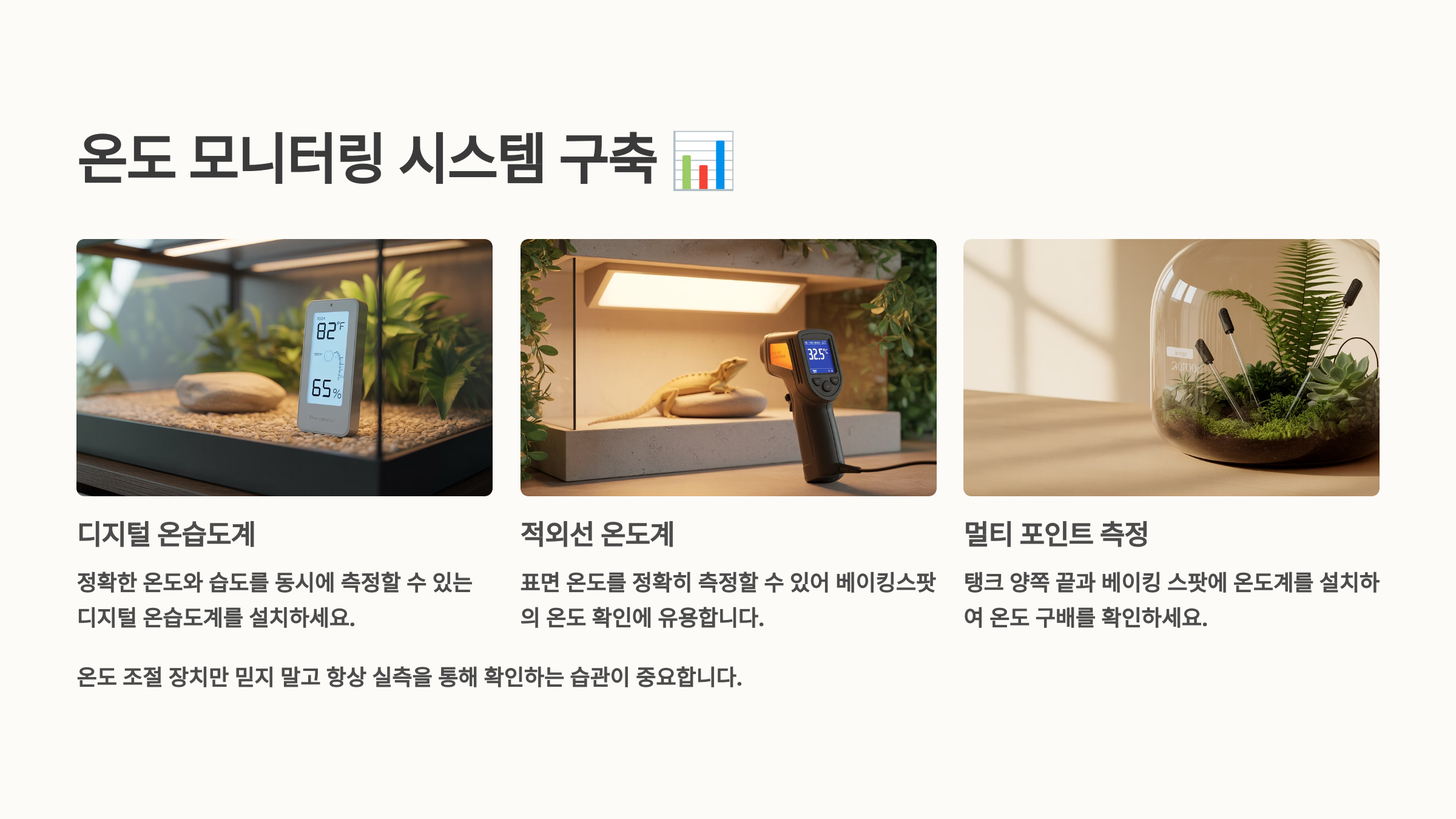온도계는 크게 디지털과 아날로그로 나뉘는데, 정확도를 위해서는 디지털 온도계를 추천해요. 프로브(센서)가 달린 디지털 온도계는 원하는 위치의 정확한 온도를 측정할 수 있어요. 최소 2개 이상의 온도계를 사용해서 바스킹 스팟과 쿨존의 온도를 동시에 모니터링하는 것이 좋아요. 가능하다면 3개를 사용해서 웜존까지 체크하면 더욱 완벽해요.