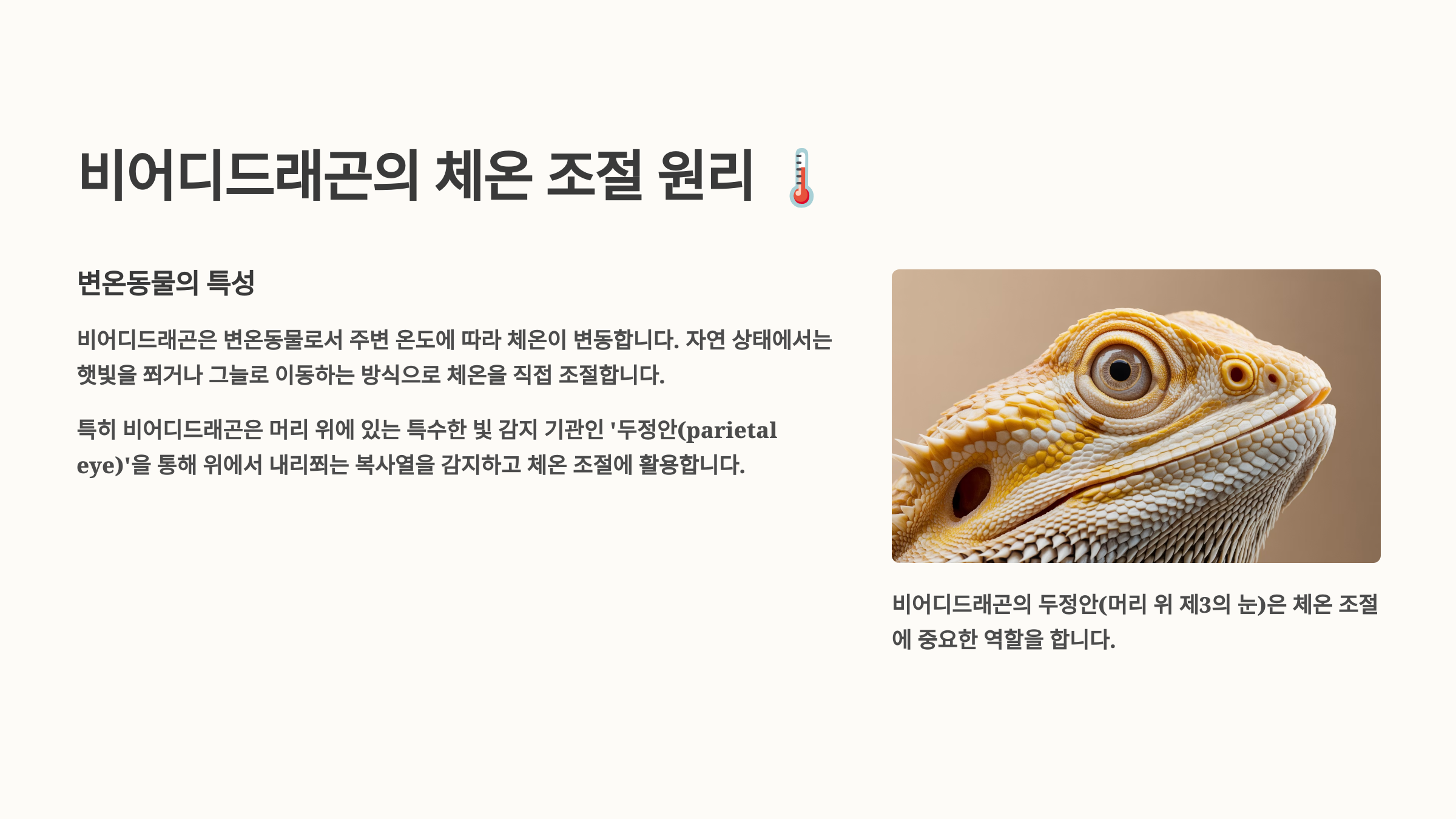 비어디드래곤은 변온동물이기 때문에 스스로 체온을 만들어낼 수 없어요. 대신 주변 환경의 온도를 이용해 체온을 조절하는데, 이를 '행동적 체온조절'이라고 해요. 야생에서는 아침에 바위 위에 올라가 일광욕을 하고, 너무 더워지면 그늘로 이동하는 방식으로 체온을 유지한답니다. 사육장에서도 이런 자연스러운 행동을 할 수 있도록 환경을 조성해주는 것이 핵심이에요.