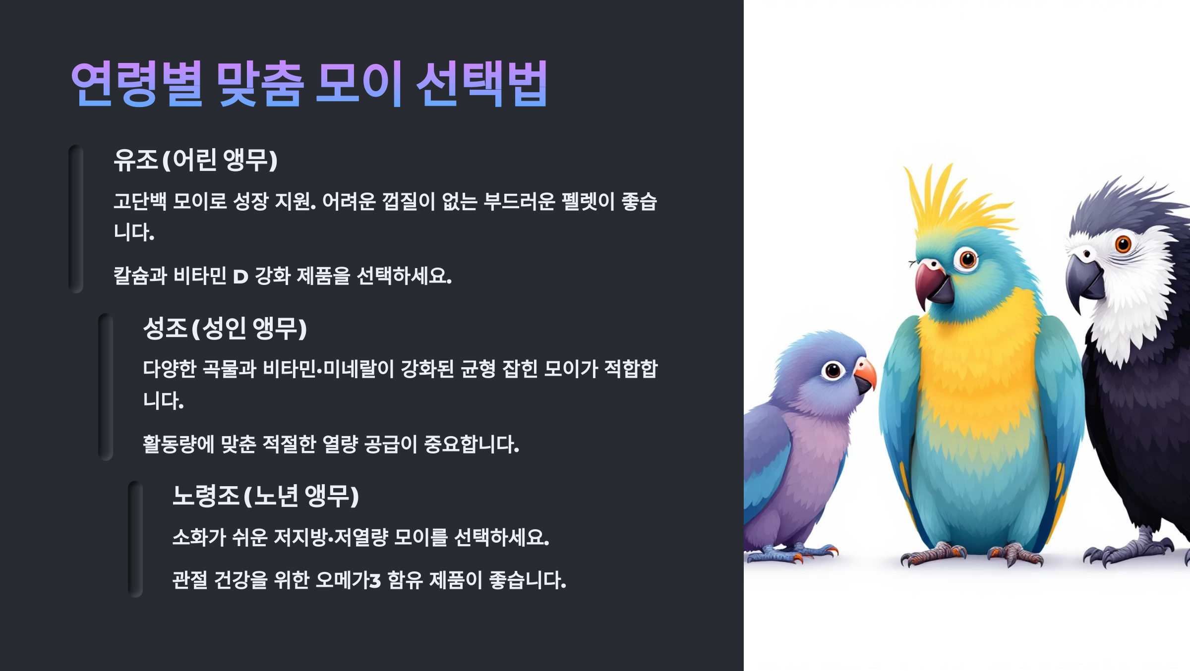 앵무새도 사람처럼 연령에 따라 필요한 영양소가 달라져요. 새끼 앵무새, 성체 앵무새, 노령 앵무새 각각에게 맞는 모이를 선택해야 건강하게 키울 수 있어요. 특히 새끼 앵무새는 급속한 성장이 이루어지는 시기라서 성체보다 더 많은 단백질과 칼로리가 필요해요.