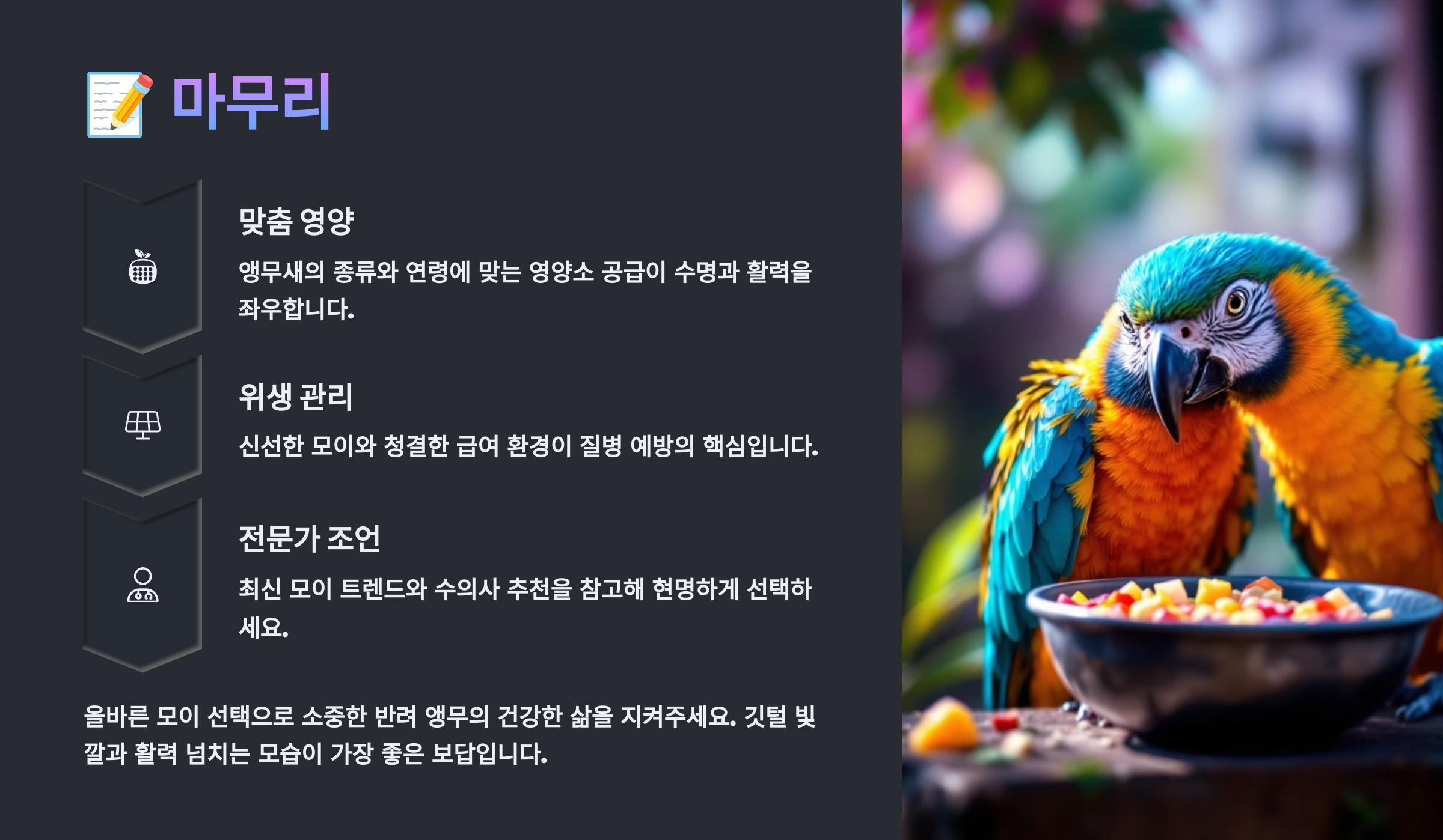 앵무새를 키우는 것은 단순한 취미가 아니라 하나의 생명을 책임지는 일이에요. 올바른 영양 공급을 통해 여러분의 앵무새가 건강하고 행복한 삶을 살 수 있도록 도와주세요. 작은 관심과 세심한 배려가 모여서 큰 차이를 만들어낸답니다.