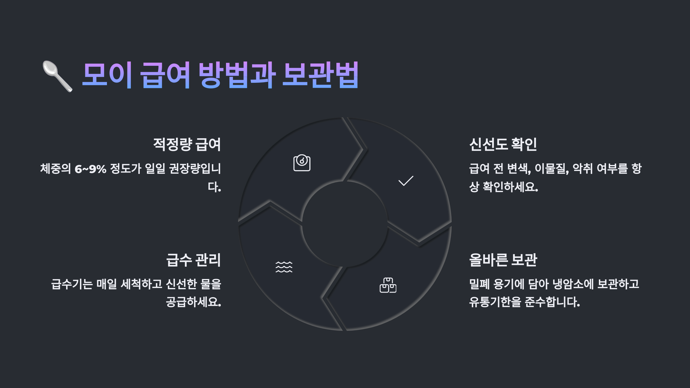 모이 보관법도 매우 중요해요. 개봉한 모이는 밀폐용기에 담아서 서늘하고 건조한 곳에 보관하세요. 냉장고에 보관하는 것도 좋은 방법이에요. 다만 냉장고에서 꺼낸 모이는 상온에서 30분 정도 둔 후에 급여하세요. 갑자기 차가운 먹이를 주면 소화에 문제가 생길 수 있어요.