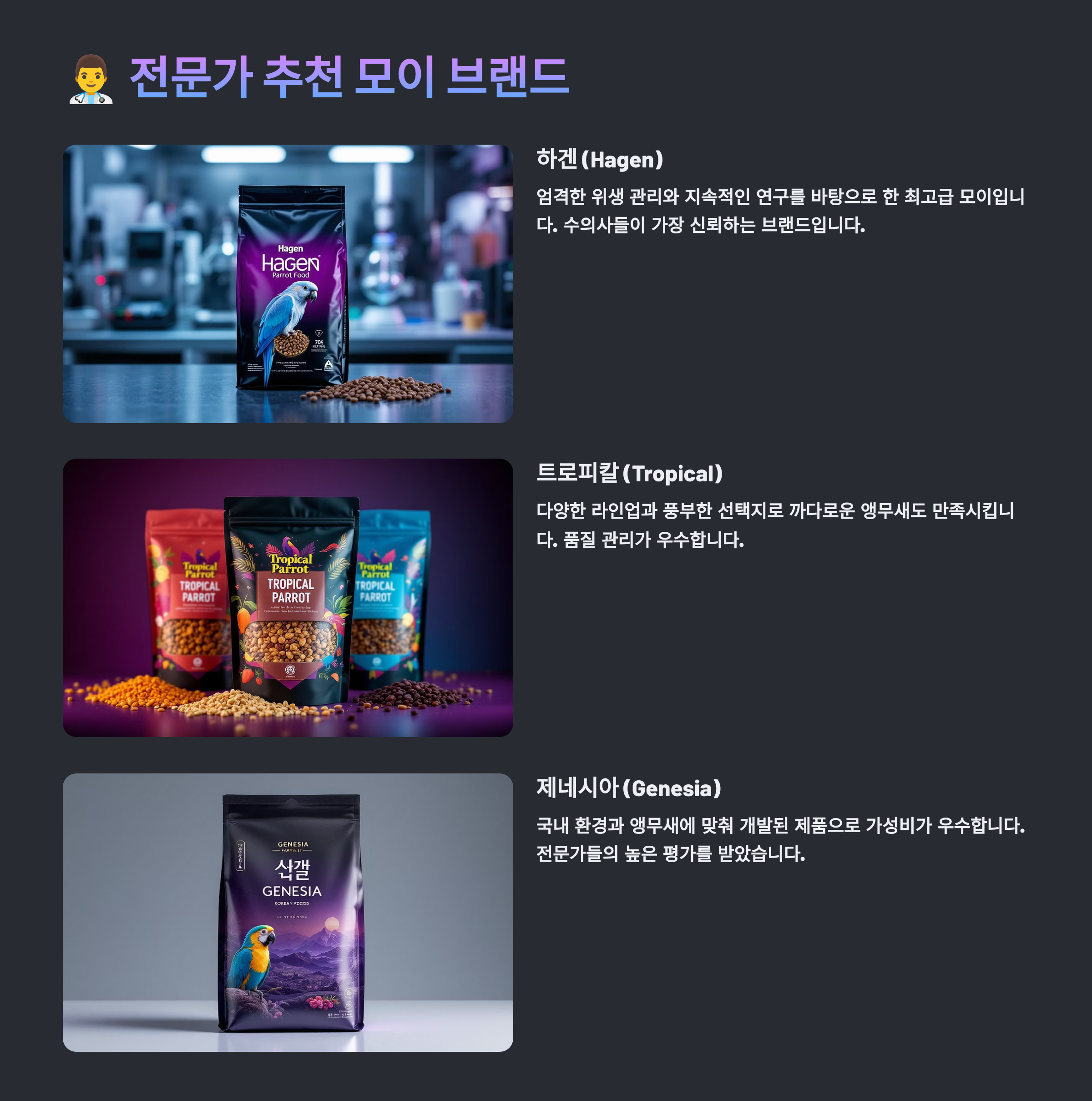 조류 전문 수의사들과 앵무새 전문 브리더들이 가장 많이 추천하는 브랜드들을 소개해드릴게요. 서울대학교 수의과대학 조류 클리닉에서 20년간 앵무새를 진료해오신 김○○ 교수님께서는 "영양 균형과 안전성이 검증된 브랜드를 선택하는 것이 가장 중요하다"고 강조하셨어요.