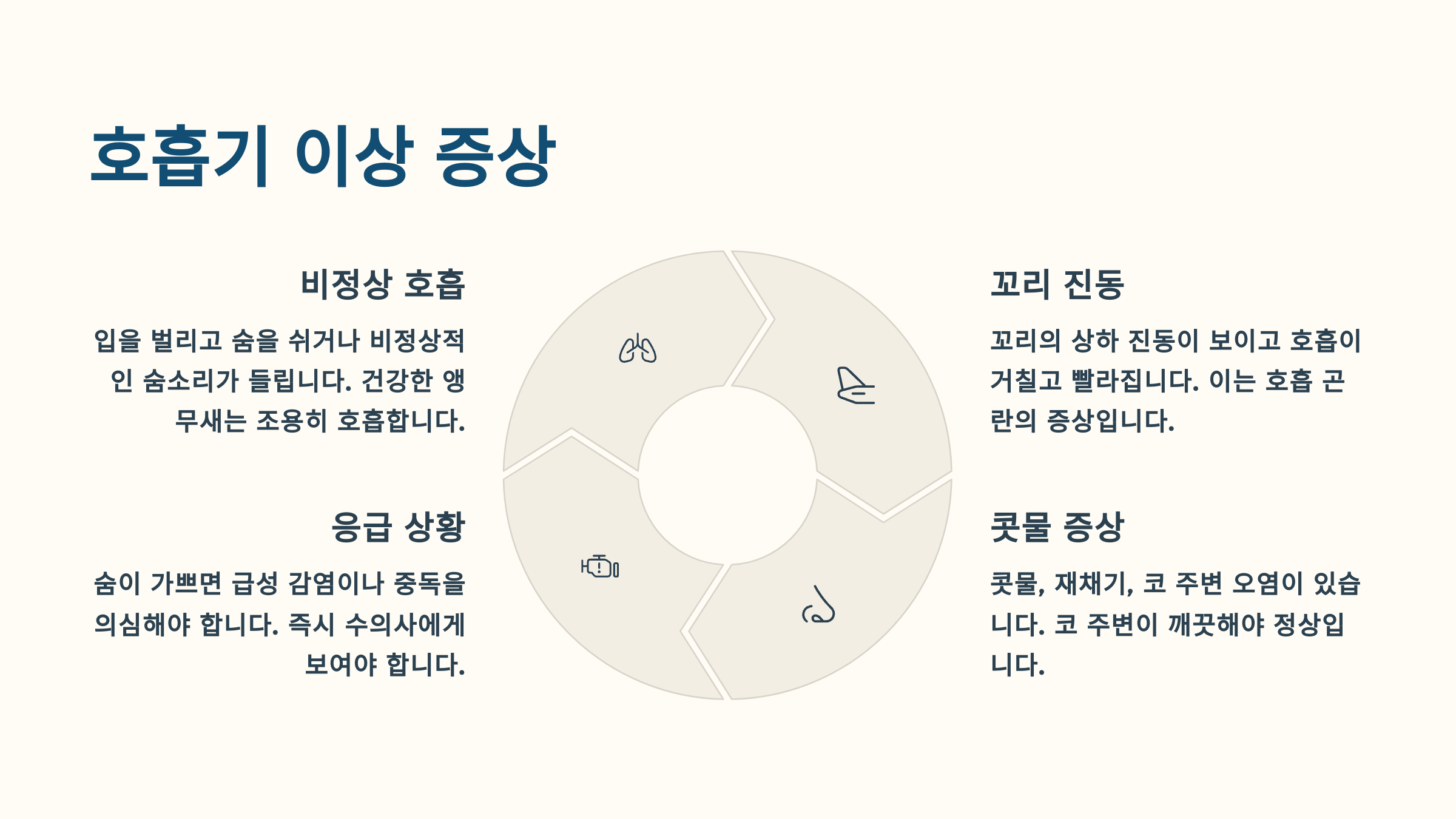 앵무새의 호흡기 문제는 생명을 위협할 수 있는 심각한 상황이에요. 앵무새는 포유류와 다른 독특한 호흡기 구조를 가지고 있어서, 호흡기 감염이나 질환에 매우 취약해요. 정상적인 앵무새는 조용하고 규칙적으로 호흡하는데, 만약 호흡할 때 소리가 나거나 숨을 헐떡이는 모습을 보인다면 즉시 응급조치가 필요해요. 특히 부리를 벌리고 호흡하거나 목을 길게 뻗고 숨쉬는 모습은 심각한 호흡곤란의 신호예요.