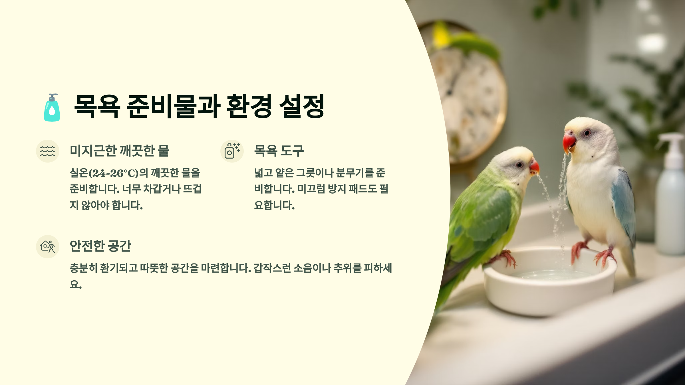철저한 준비가 성공적인 목욕의 첫걸음이에요. 안전하고 편안한 환경에서 앵무새가 목욕을 즐길 수 있도록 세심하게 준비해주세요! 🧴