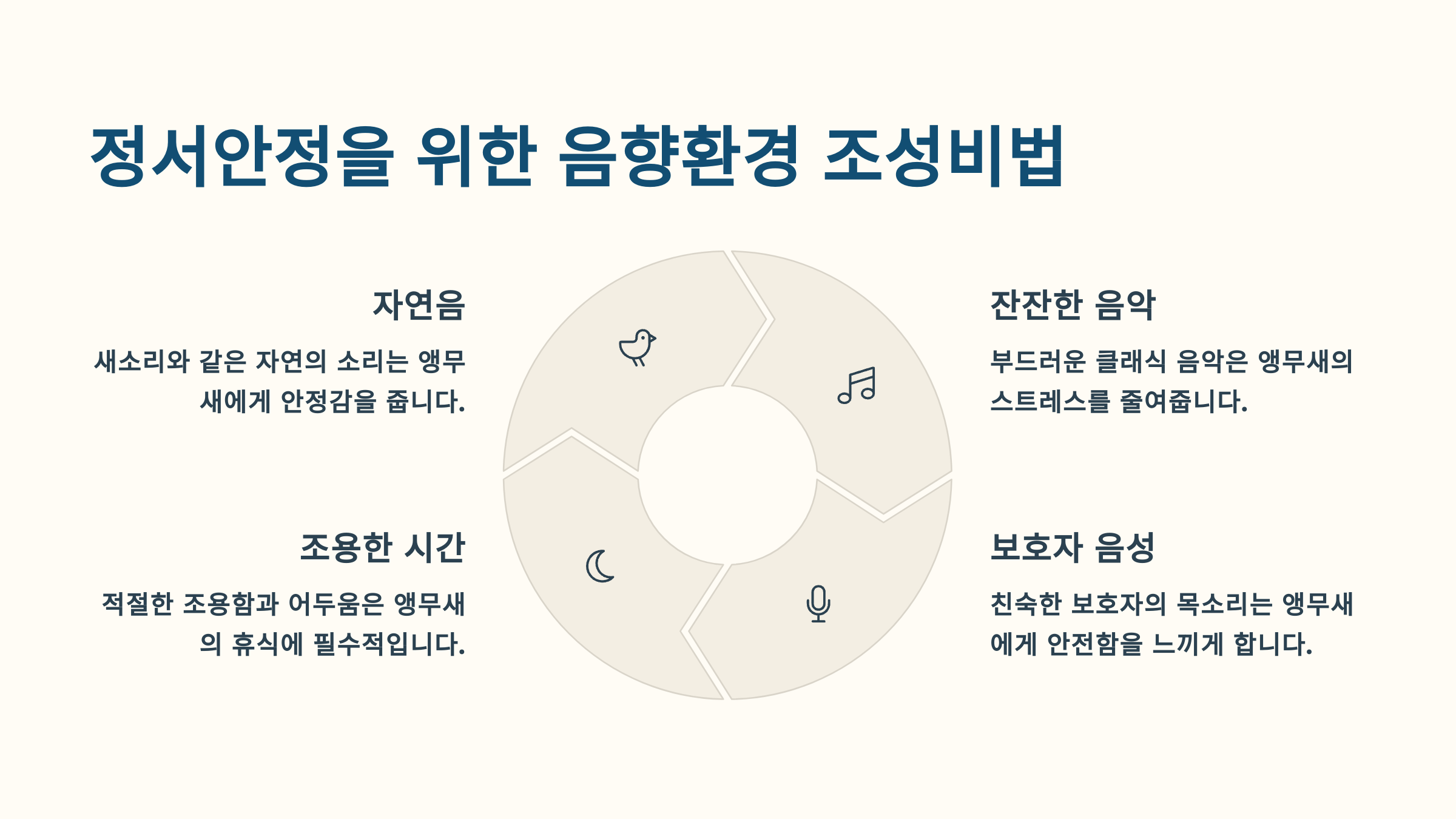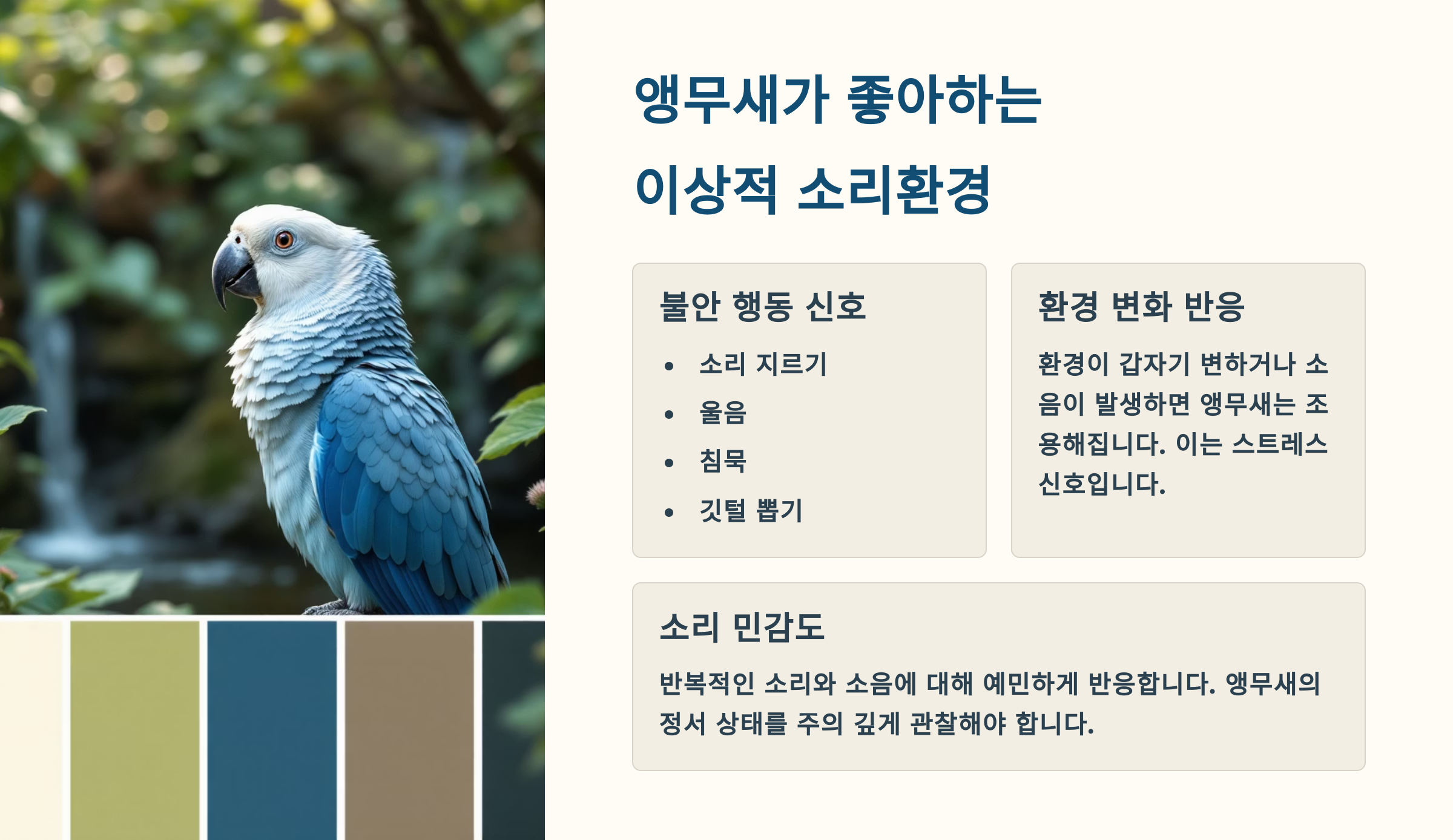 앵무새가 가장 편안해하는 소리환경은 자연음이 베이스가 되는 공간이에요. 새소리, 바람소리, 물소리 같은 자연의 소리들은 앵무새의 본능적인 안정감을 자극해서 스트레스를 줄여주는 효과가 있어요. 특히 같은 종류의 새소리를 들으면 사회적 욕구도 어느 정도 충족시킬 수 있답니다.