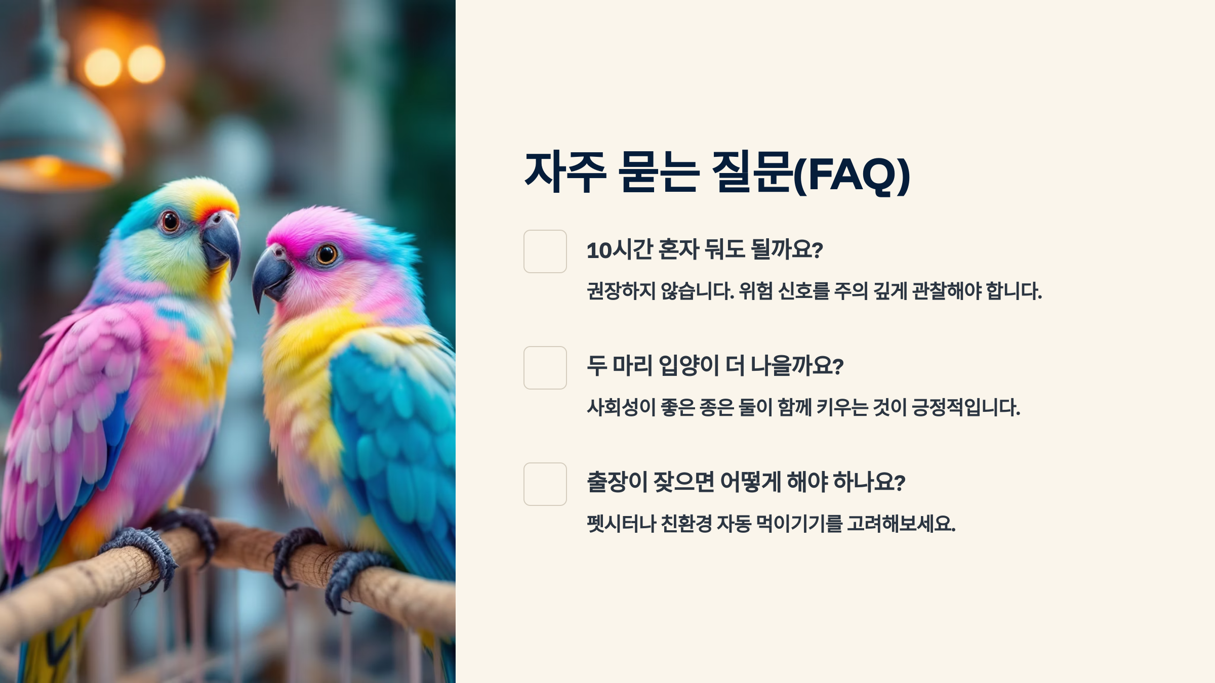 Q5. 앵무새 두 마리를 함께 키우면 혼자 두는 시간이 더 길어져도 괜찮나요?