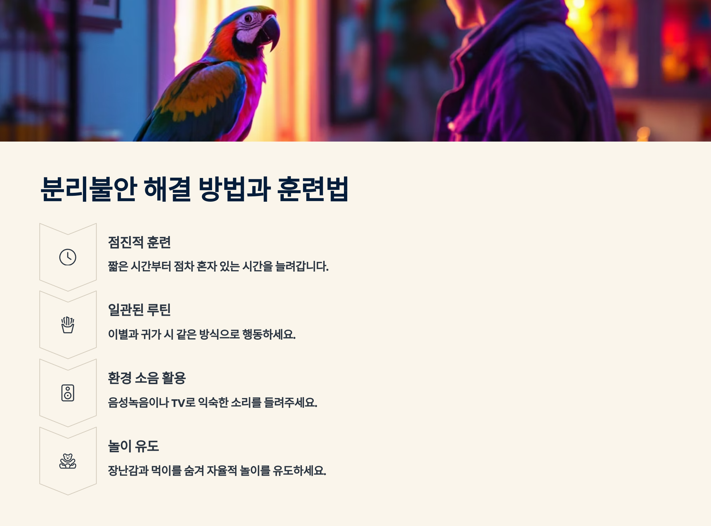 단계별로 차근차근 훈련하면 분리불안을 극복할 수 있어요. 급하게 서두르지 말고 앵무새의 속도에 맞춰주세요! 📈