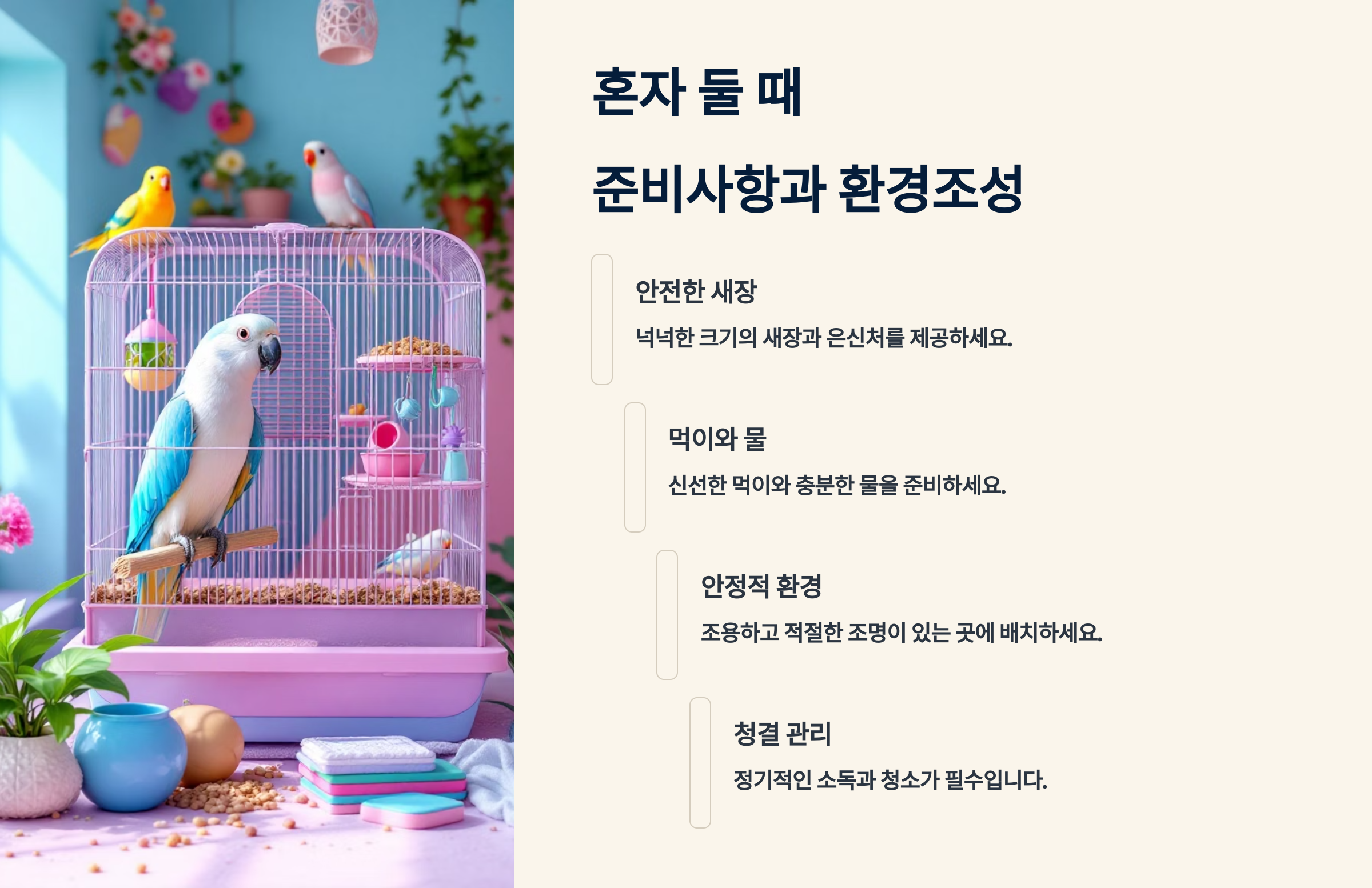 좋은 환경 조성은 앵무새가 혼자 있는 시간을 더 편안하게 보낼 수 있게 도와줘요. 투자한 만큼 앵무새의 건강과 행복이 보장될 거예요! 💡