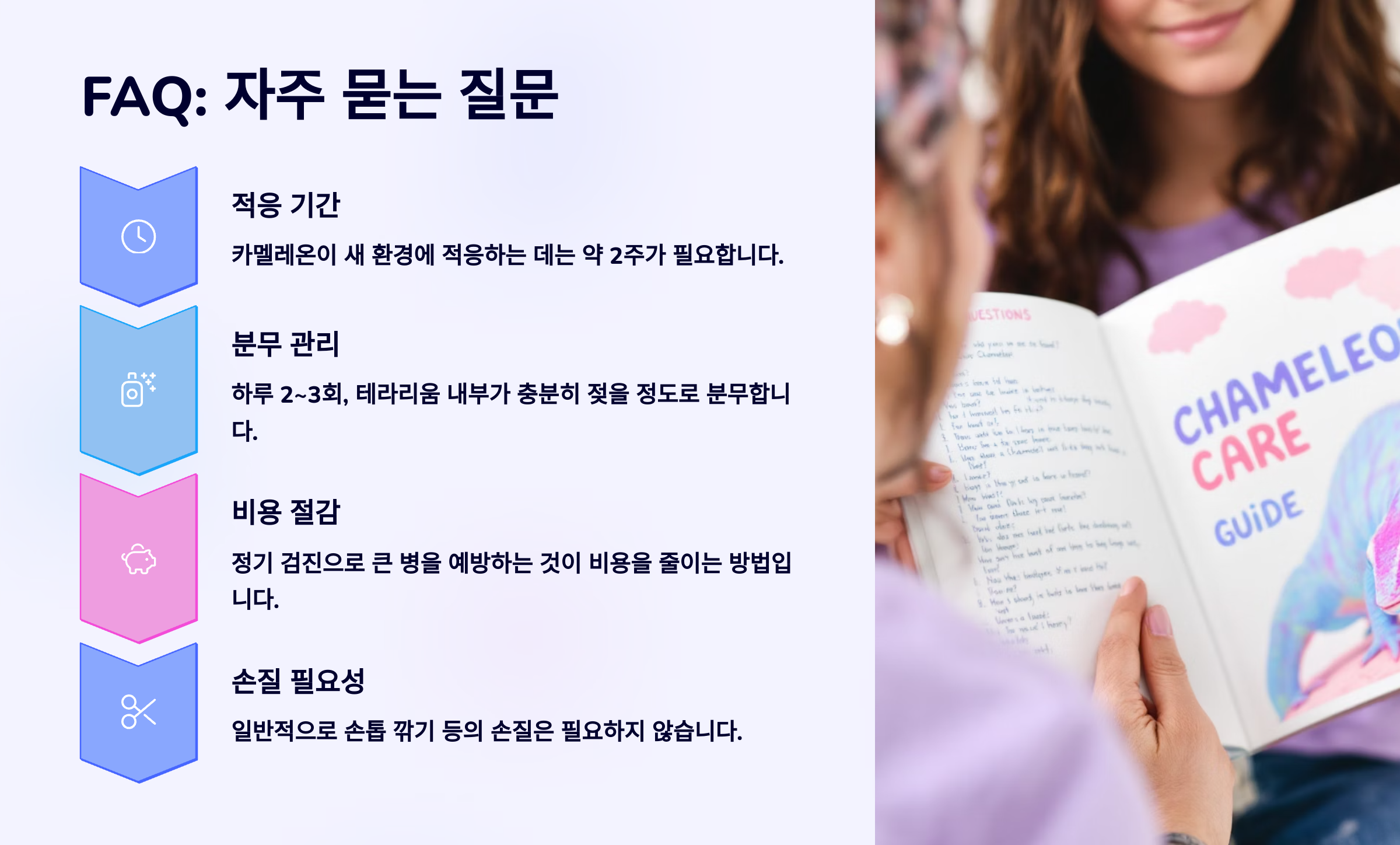 📌 입양 전 반드시 사육 환경과 생활 패턴을 이해해야 하고, 충분한 정보 없이 갑자기 입양하면 카멜레온에게 큰 스트레스가 돼요. 관찰형 동물이라는 점을 꼭 기억하고 접근해야 해요 🐍