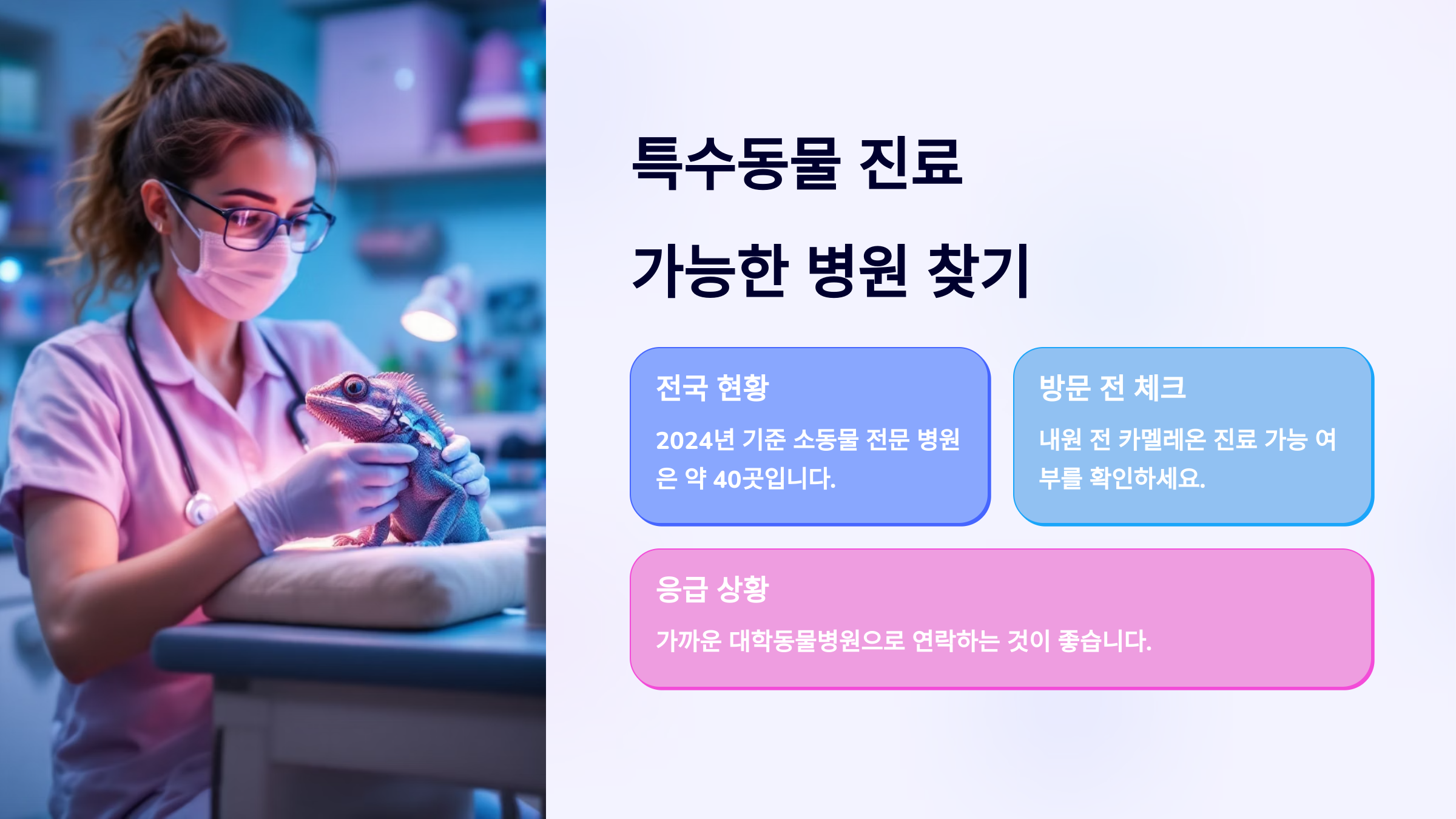🏥 카멜레온은 일반적인 개, 고양이 병원에서 진료가 어려워요. 특수동물(Exotic Pet) 진료가 가능한 동물병원을 따로 찾아야 하고, 대부분의 지역에서는 대형 병원이나 전문 병원에 집중되어 있어요.