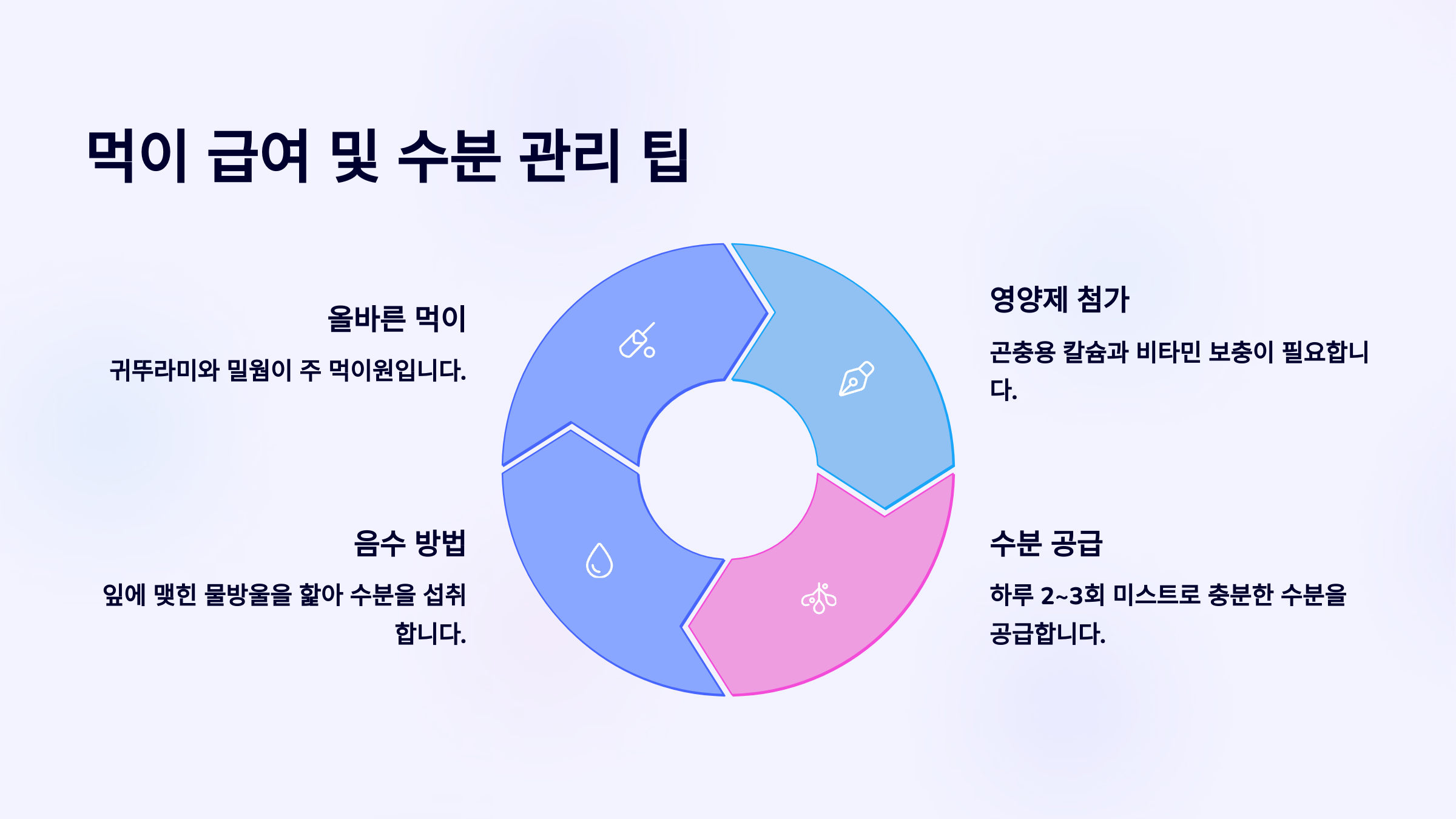 이제 🌿 먹이 급여 및 수분 관리 팁으로 넘어가서, 건강 유지의 핵심인 먹이와 수분 공급을 어떻게 할지 알려드릴게요!