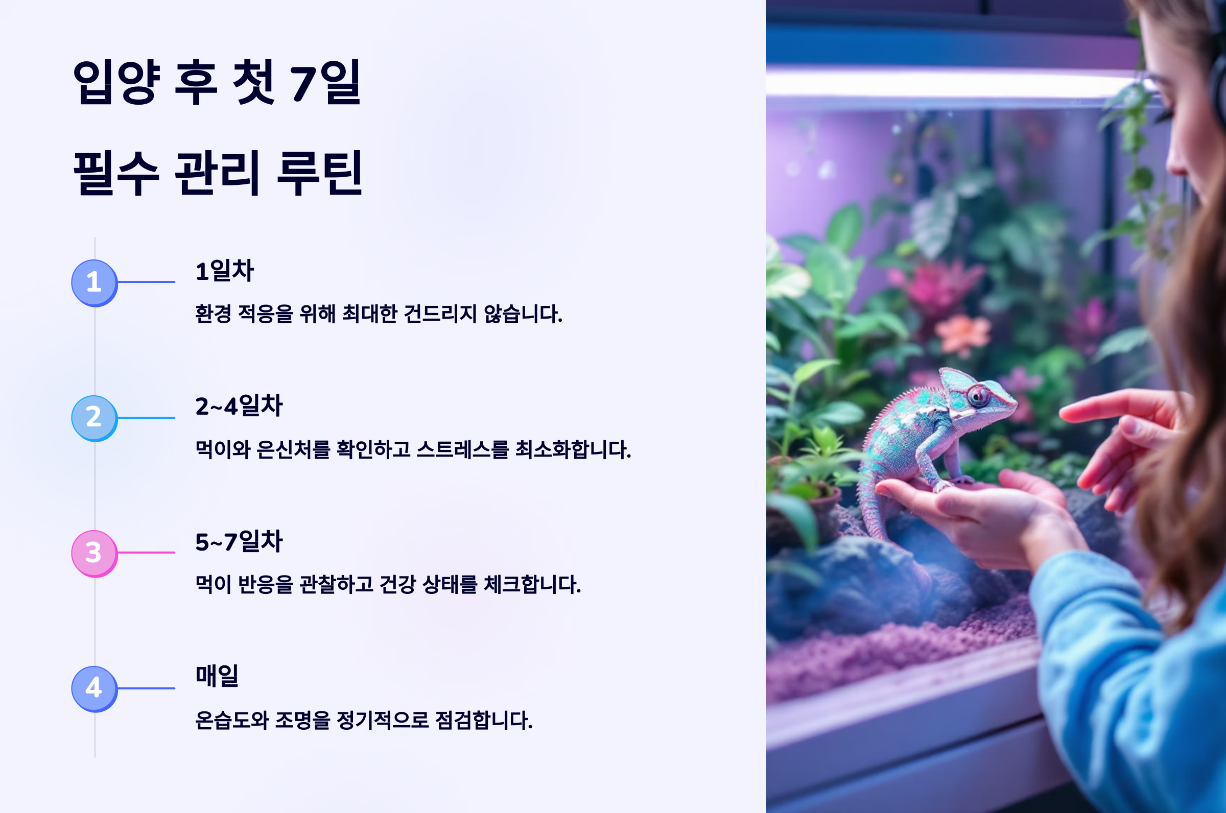 🗓️ 카멜레온 입양 후 첫 일주는 적응 여부를 결정짓는 가장 중요한 시기예요. 이 시기에 스트레스를 받으면 식욕부진, 탈수, 탈피 문제가 발생하기 쉬워요. 그래서 아주 조심스럽고 체계적인 관리가 필요해요.