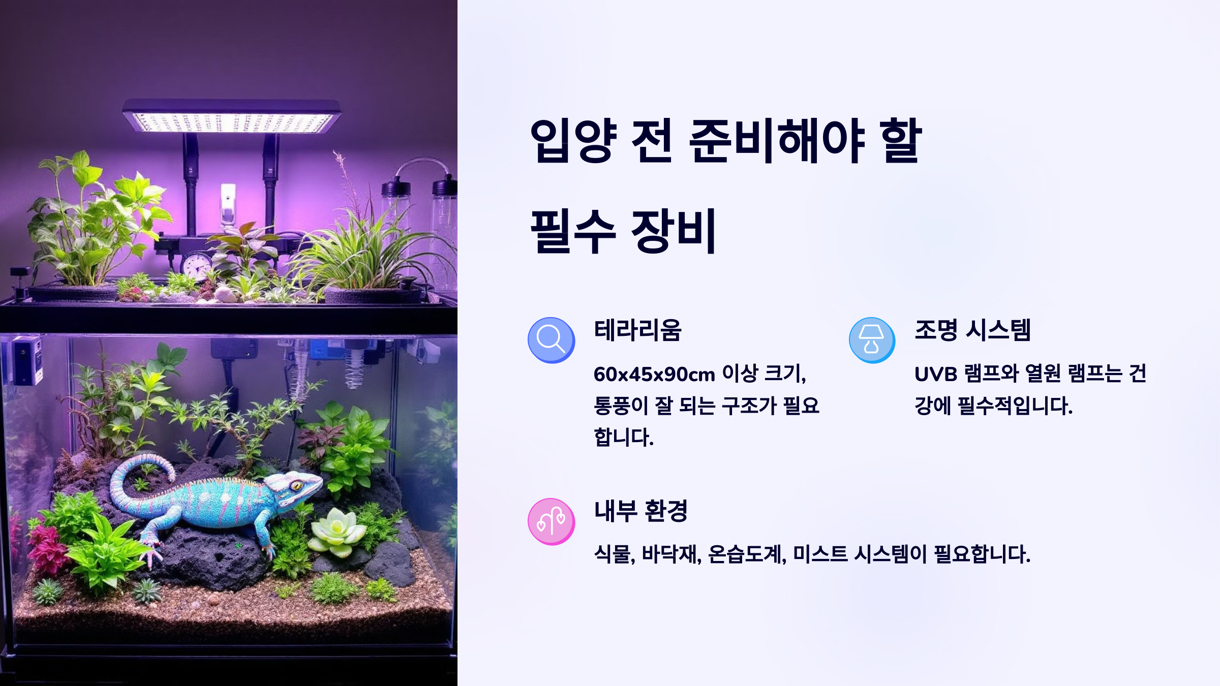 이제 📦 입양 전 준비해야 할 필수 장비로 이어가서, 카멜레온을 위한 첫 공간을 어떻게 세팅해야 하는지 알려드릴게요!