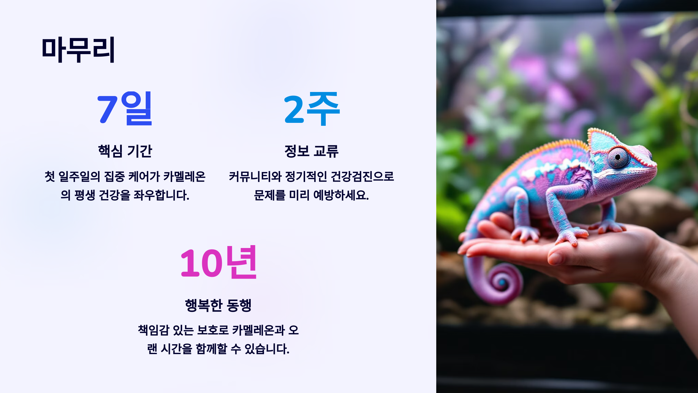 내가 생각했을 때, 카멜레온과 같은 특수동물은 더더욱 보호자의 관찰력과 책임감이 중요해요. 조금만 더 신경 쓰면 오래오래 건강하게 함께할 수 있는 반려 친구랍니다 🐾