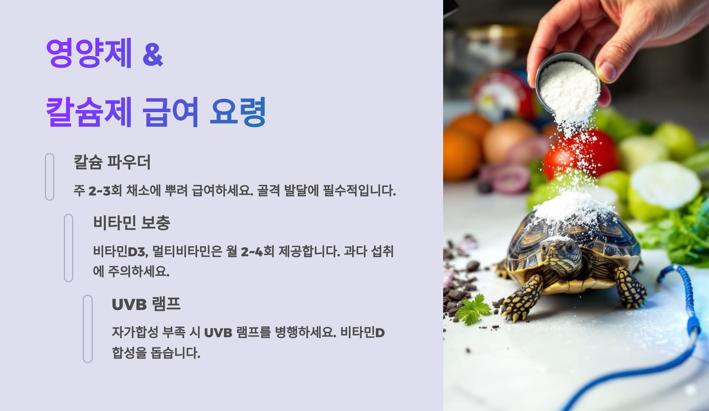 특히 햇빛을 충분히 쬐지 못하는 실내 사육 거북이는 반드시 비타민 D3를 추가로 급여하거나 UVB 조명을 사용해야 해요 🌞💡