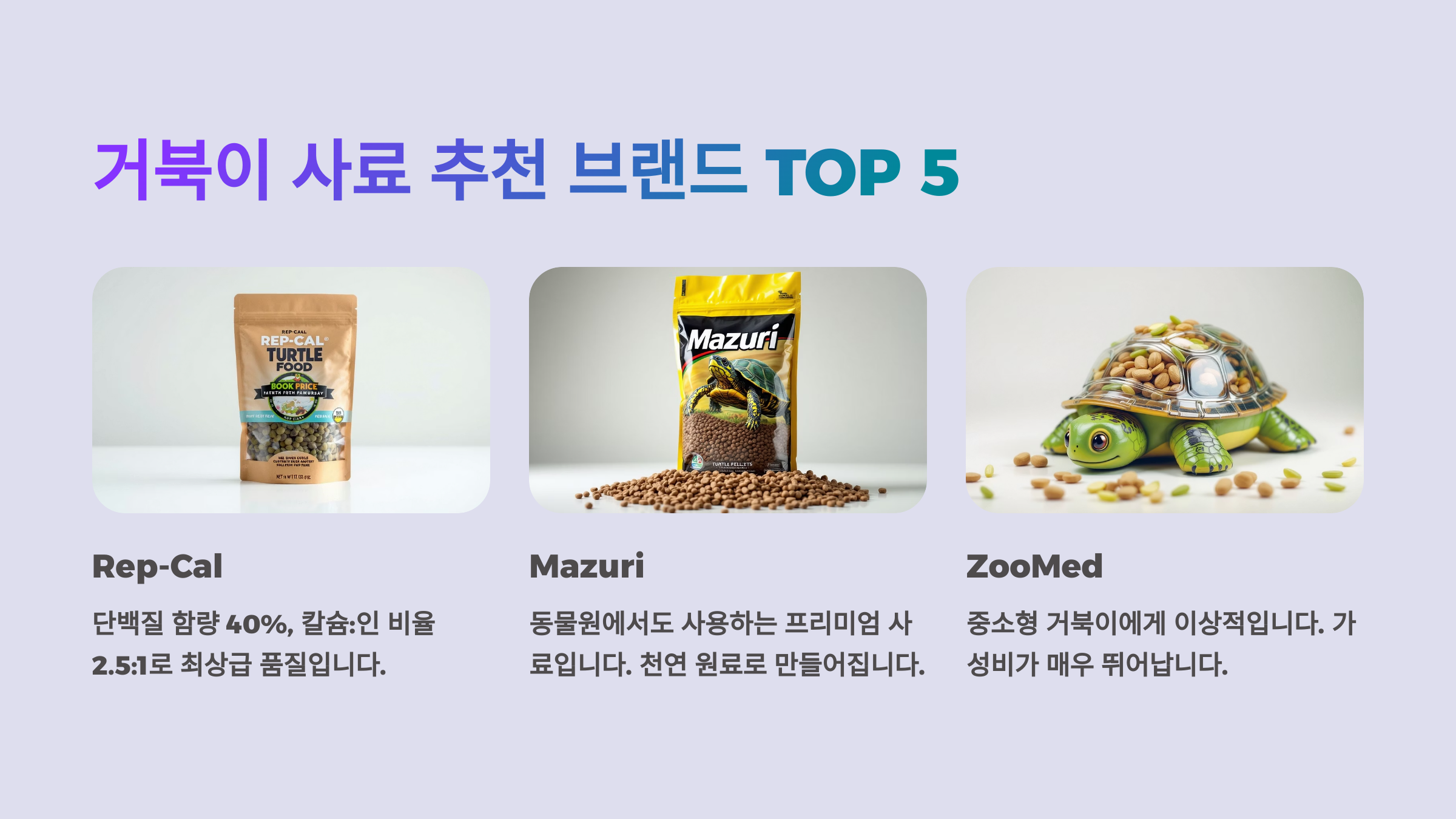 가장 많이 추천되는 거북이 사료 브랜드 TOP 5를 소개할게요: