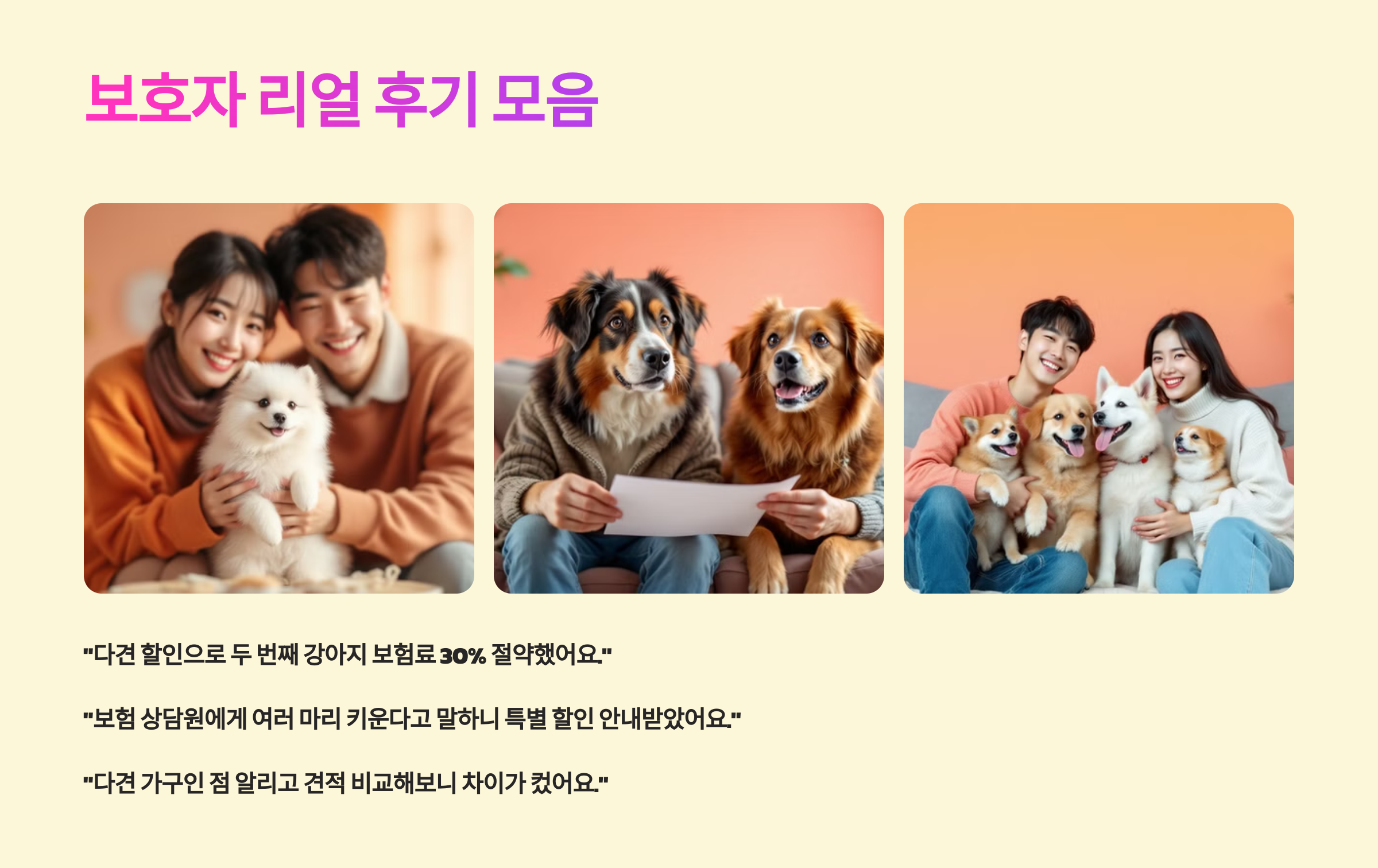 💬 다견 할인 덕분에 보험료가 줄었다는 후기 요즘 온라인 커뮤니티와 SNS에는 2마리 이상 키우는 보호자들의 실질적인 절약 후기가 많이 올라와 있어요. 그 중에서 신뢰도 높은 생생 후기들만 추려 소개해드릴게요! 🧾
