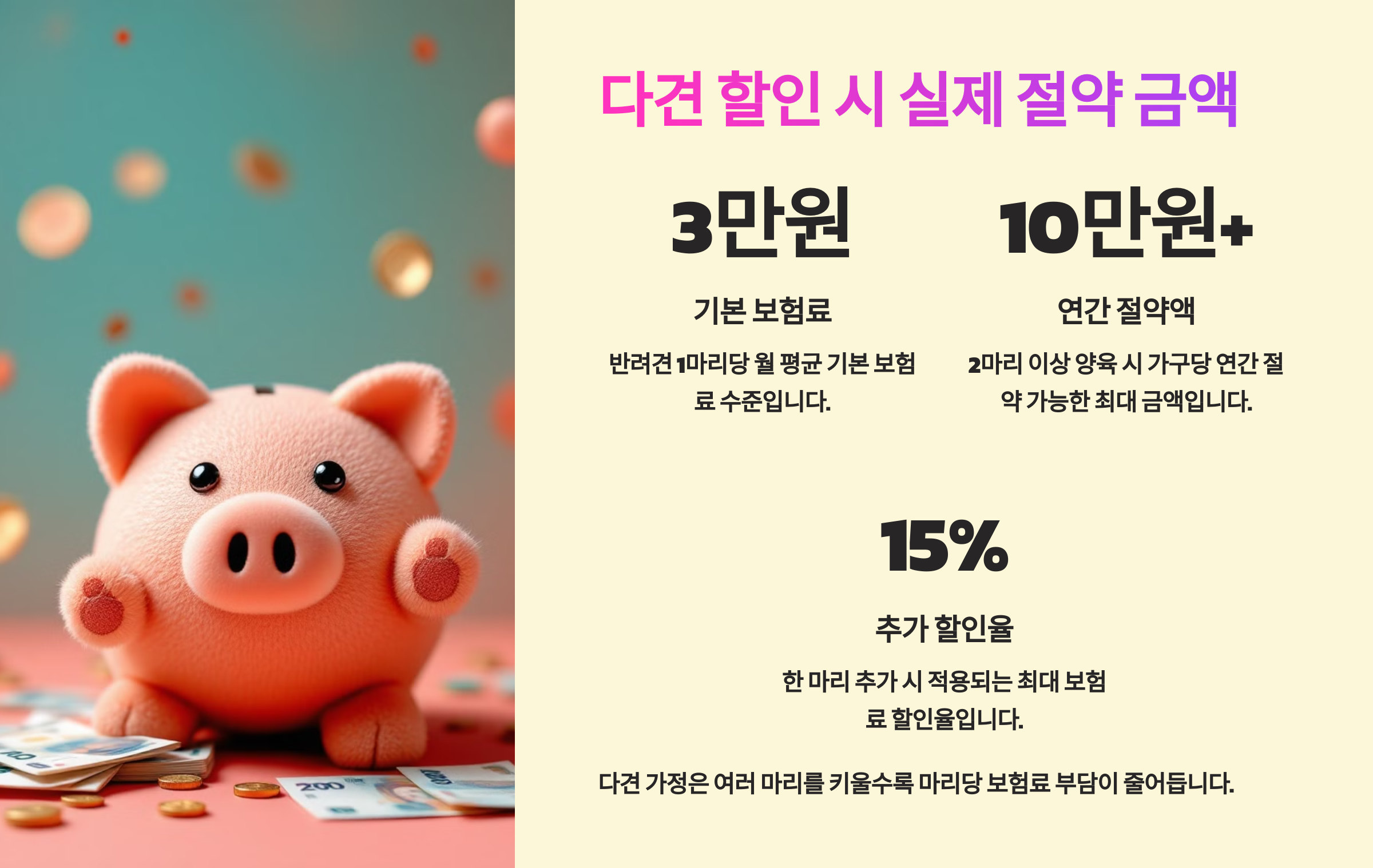 📊 다견 가구에게 적용되는 할인률은 5~15% 수준이지만 두 마리 모두 적용된다면 그 체감 절감액은 생각보다 훨씬 커요! 💥